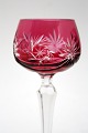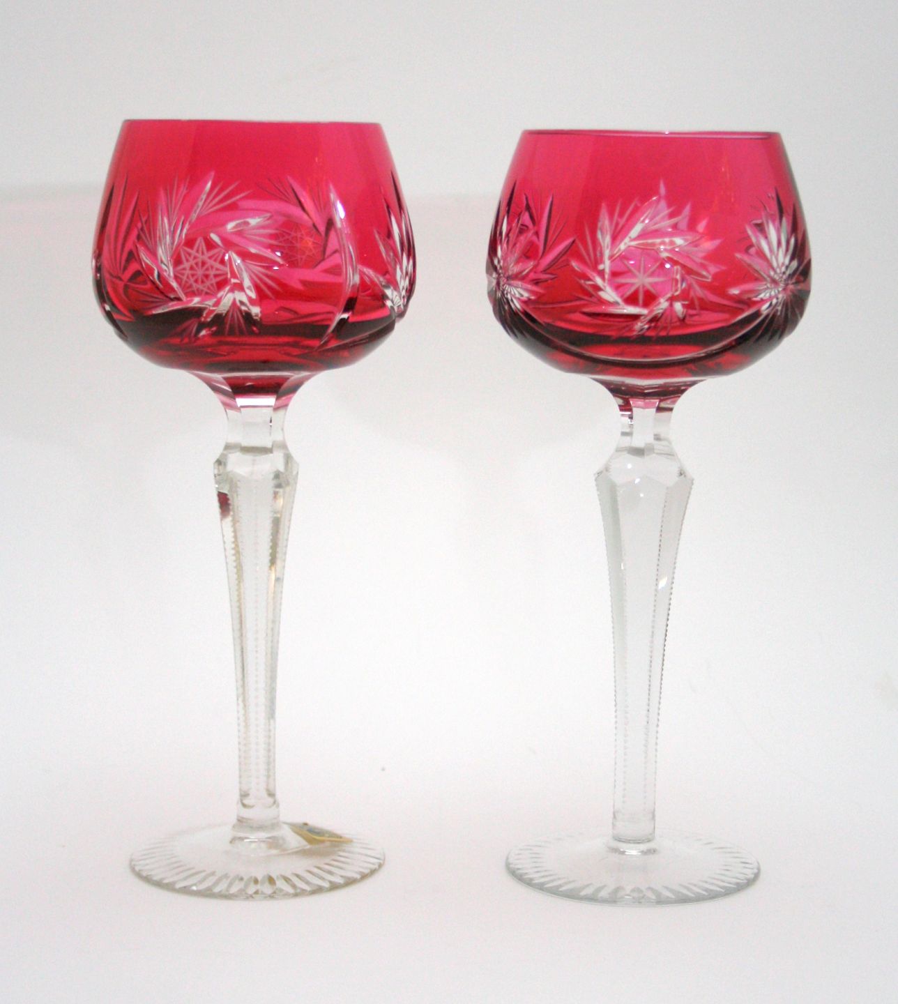 Bøhmisk krystal, Laubitzer. Røde vinglas. Mundblæst og håndskåret kumme og stilk. Højde 19 cm. Pris: SOLGT