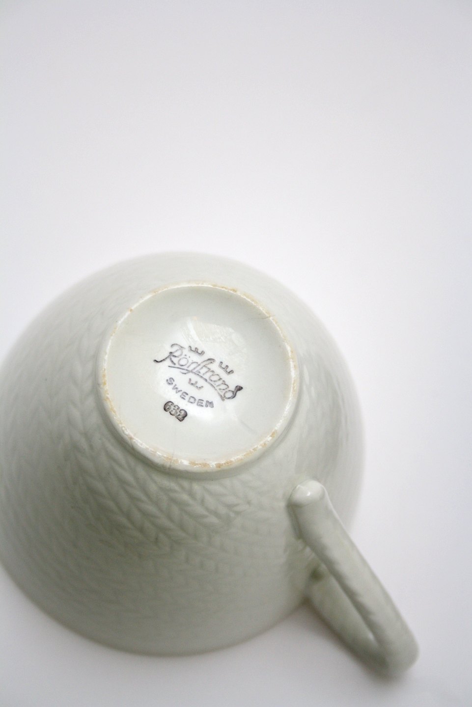 Rørstrand, Blå Eld, Stor kaffekop/tekop hvid med blå underkop. Designet af Hertha Bengtson i 1950. Formnr. 632. Højde 7,5 cm. Diameter 9 cm. God stand, men enkelte med lettere misfarvning i bunden udenpå. Pris:SOLGT