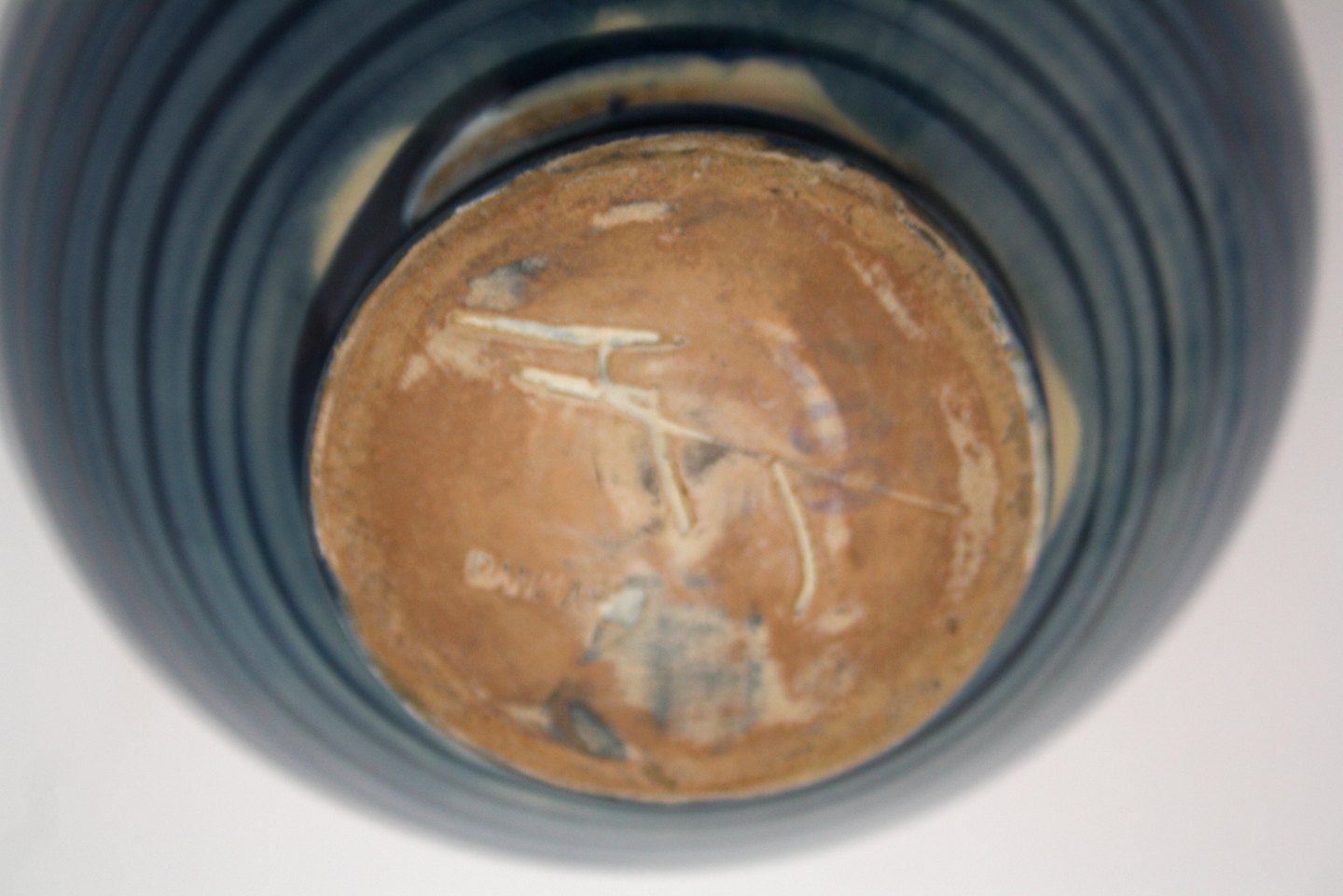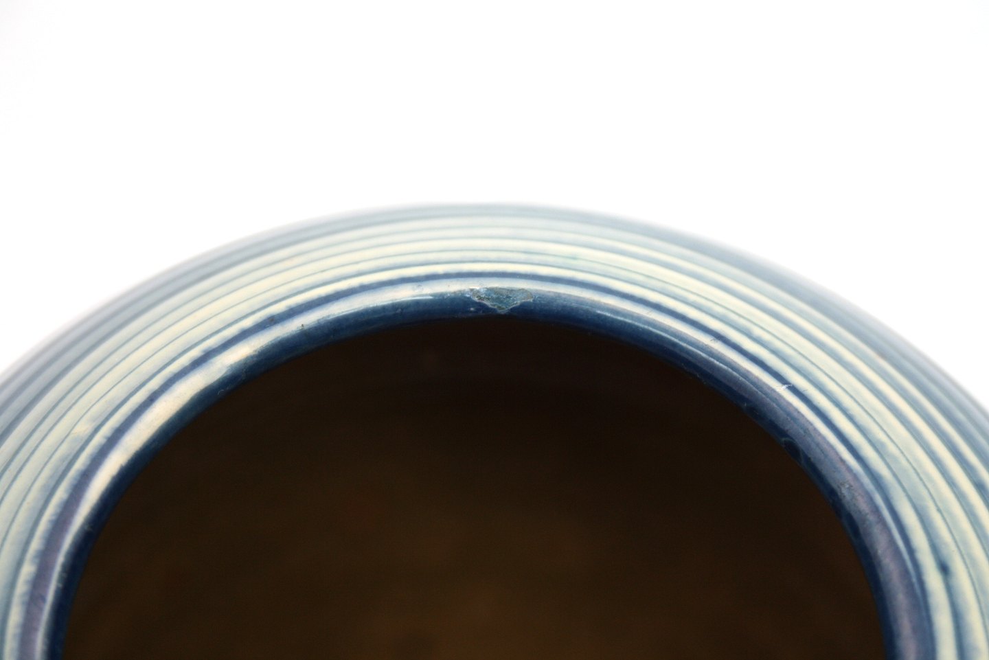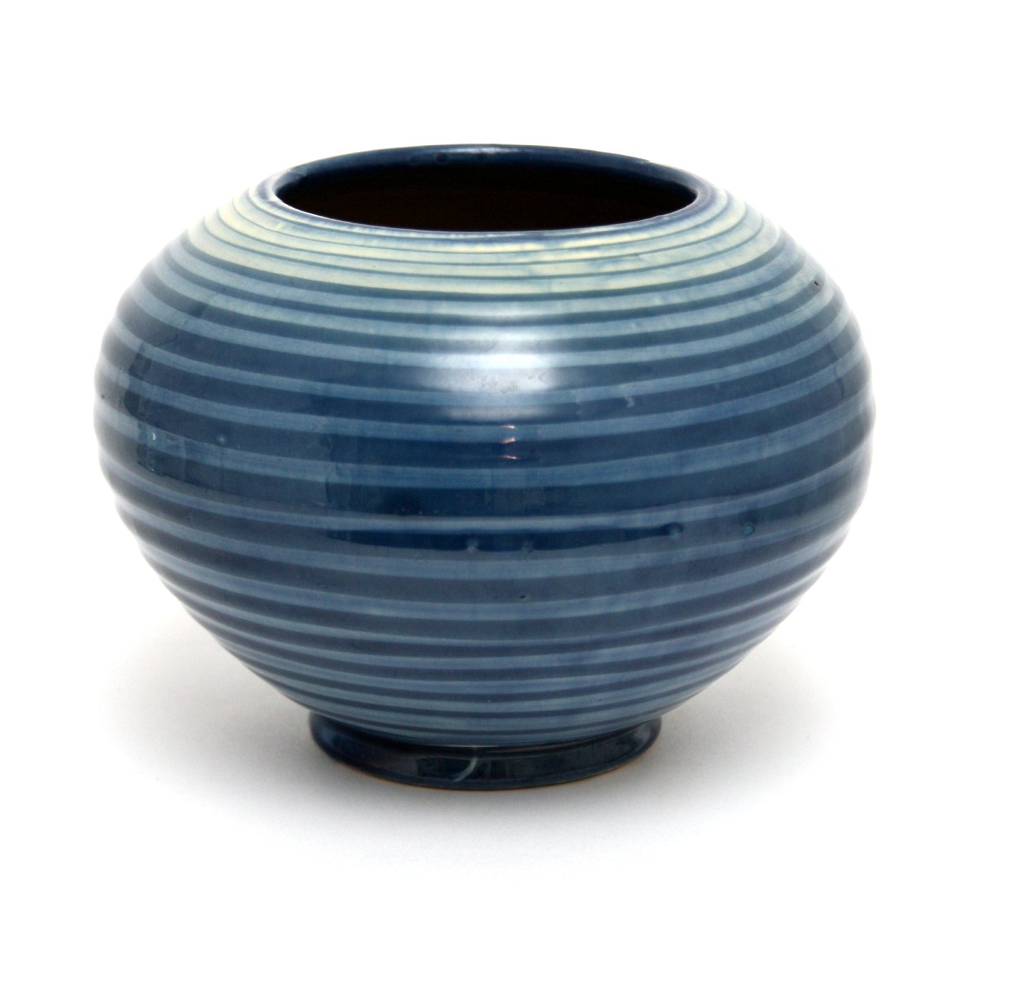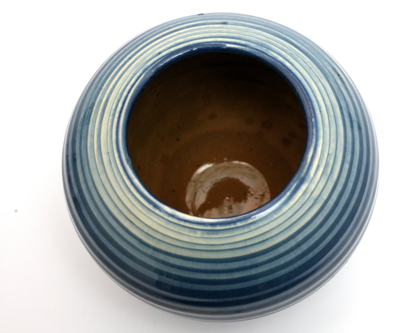 Kähler, smuk rund stribet vase i blålige nuancer og cremet glasur. Signeret HAK Denmark. Højde 11 cm. Største diameter 14 cm. Flot stand. Pris: 1850 kr.