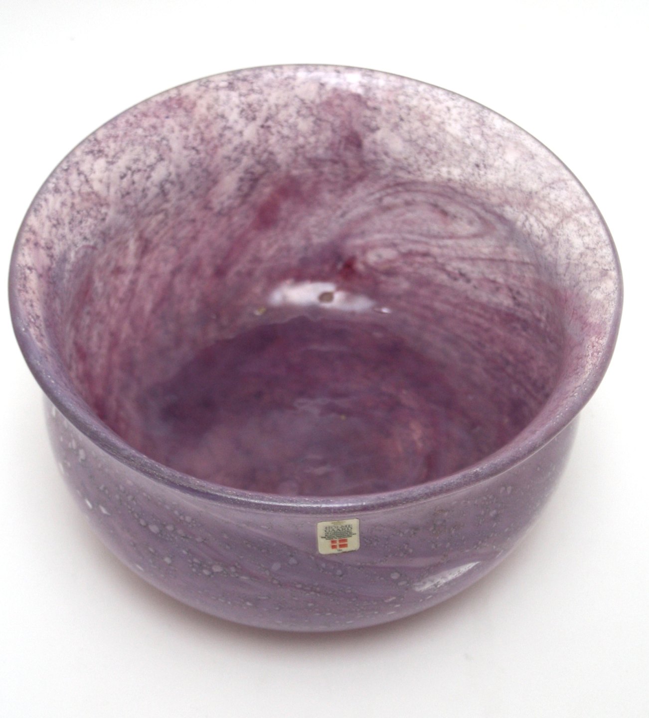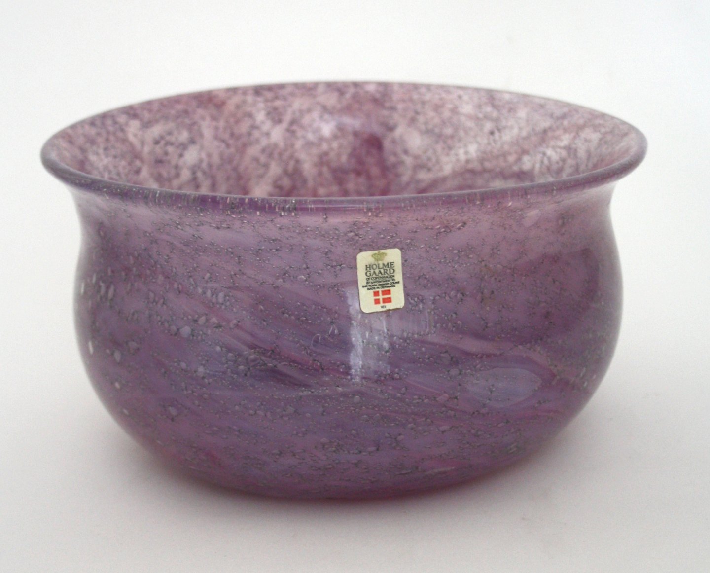 Holmegaard, syrenfarvet skål i troldeglas designet af Sidse Werner i 1975. Højde 10,5 cm. Diameter 20 cm. signeret HG, SW Pris 450 kr.