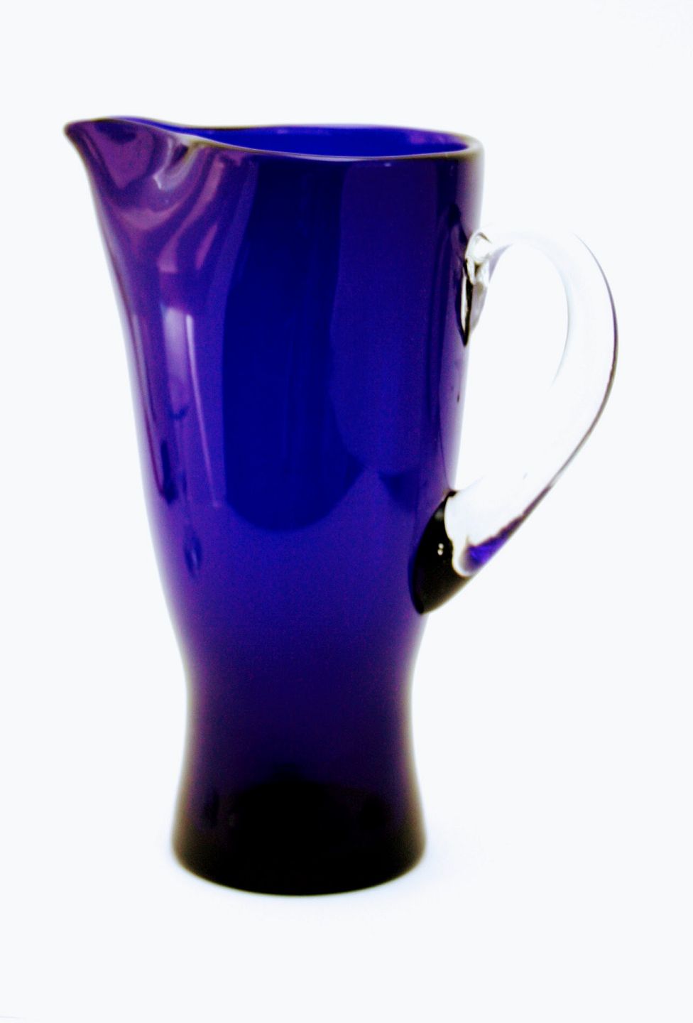 Blå glaskande med sammenpresset tud, isterningstop. Højde 21,5 cm. Fin stand. Pris: 295 kr