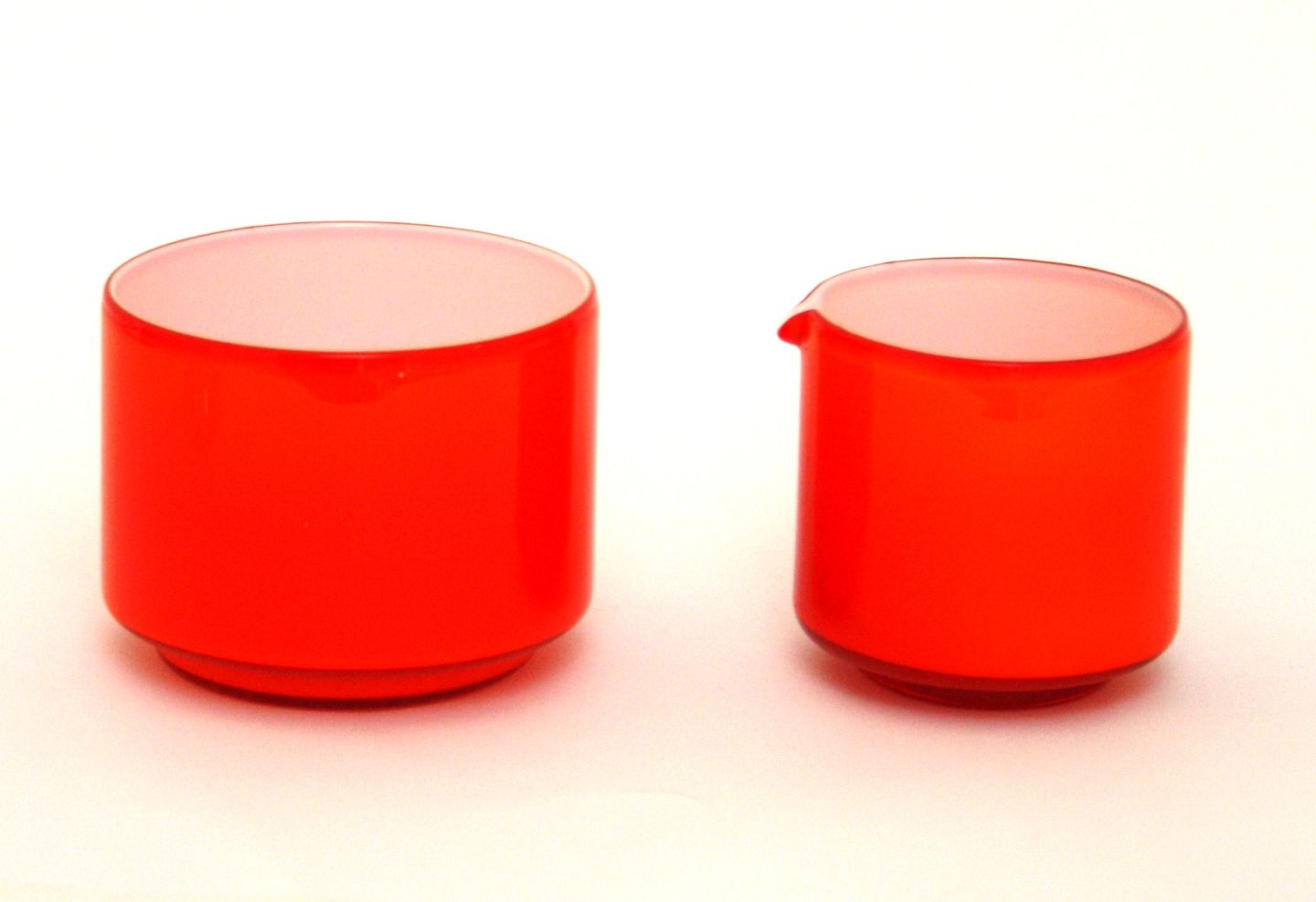 Holmegaard, Palet, Orange sukker og fløde sæt. Designet af Michael Bang. Sukkerskål. Højde 6,5 cm. Diameter 8 cm. Flødekande. Højde 6,5 cm. Diameter 6,5 cm. Flot stand. Pris: sælges samlet 400 kr.
