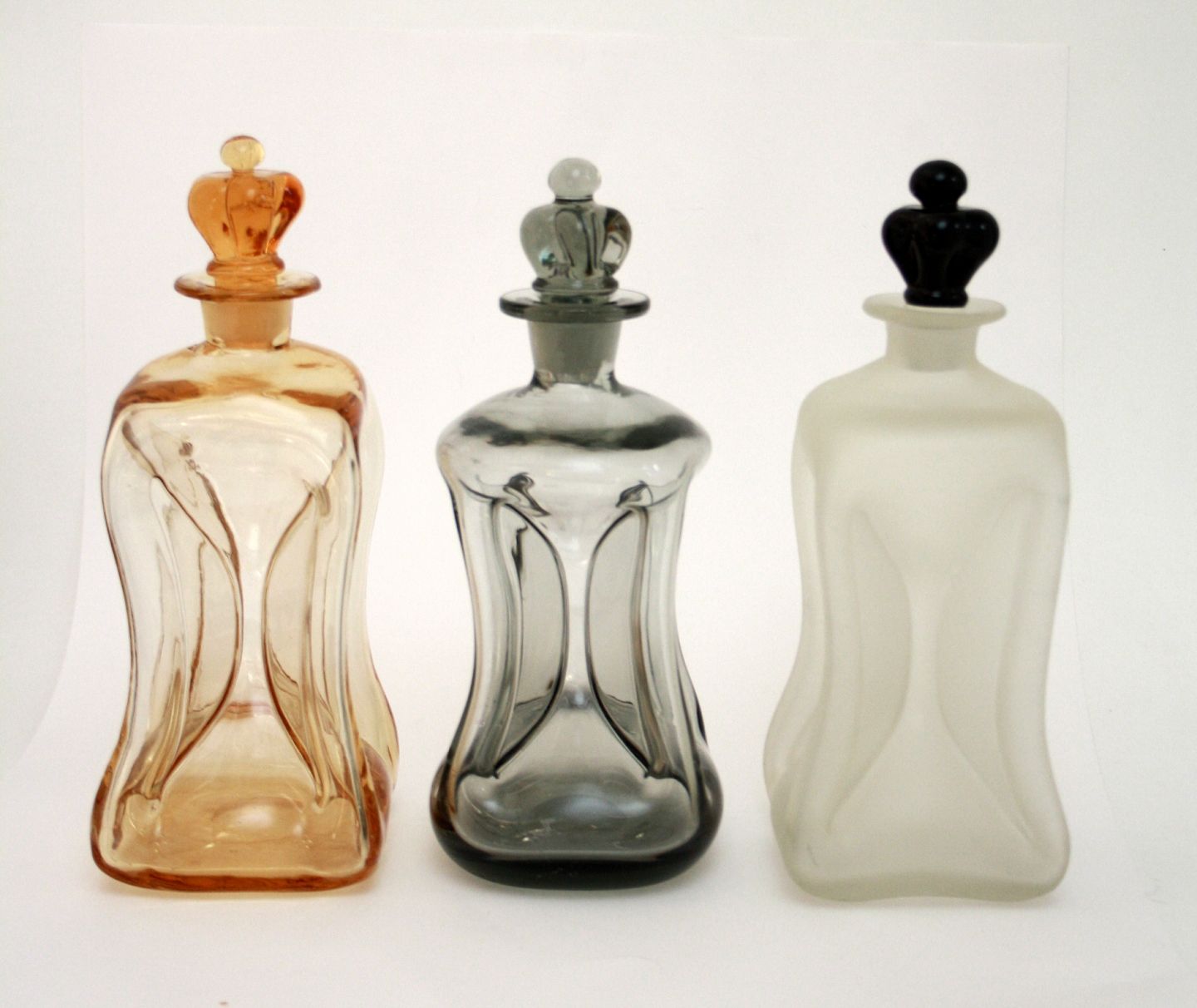 Holmegaard, Viol klukflasker med kroneprop. Designet af Jacob E Bang i 1936.