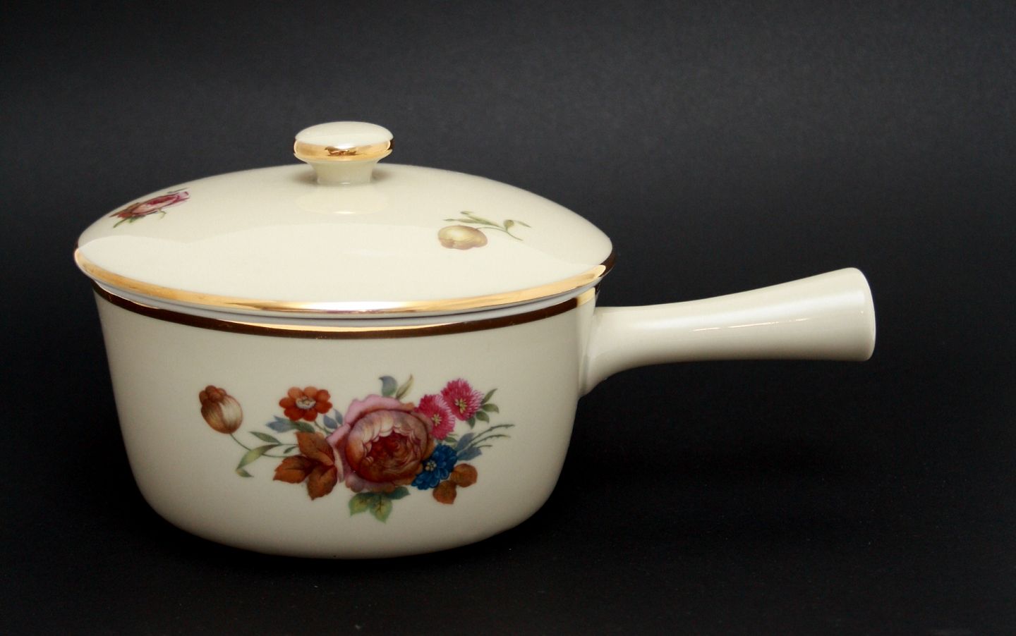 Kjøbenhavns Porcellains Maleri, Rosenborg kasserolle med låg. Flot stand. Højde 12 cm. Diameter 15 cm. Længde 22 cm. Pris: SOLGT