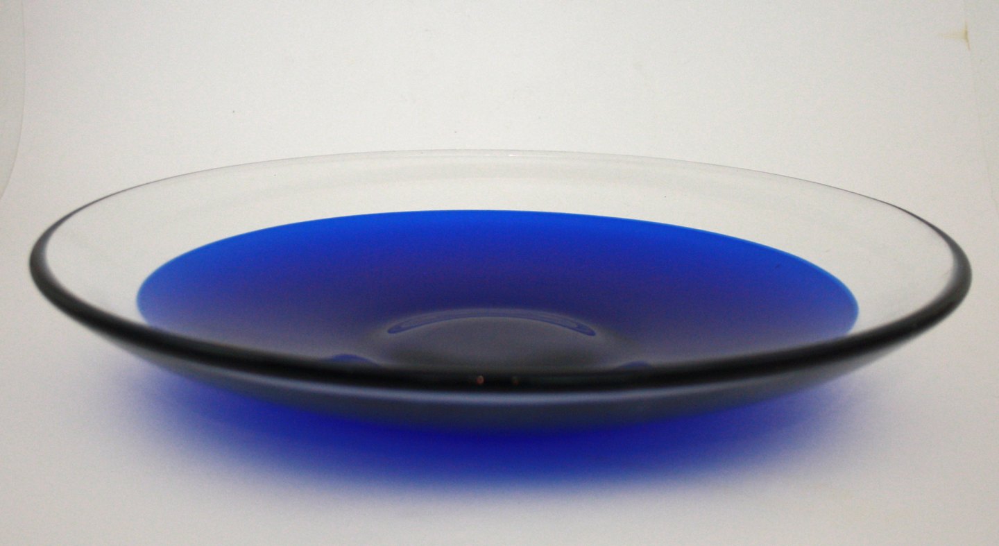 Hadeland, Norway, Blå drue koboltblå og klart glas. Designet af Willy Johansson i 1965. Skål. Højde 9 cm. Diameter 20,5 cm. Pris: SOLGT Fad. Diameter 29,5 cm. Højde 5 cm. Pris: SOLGT