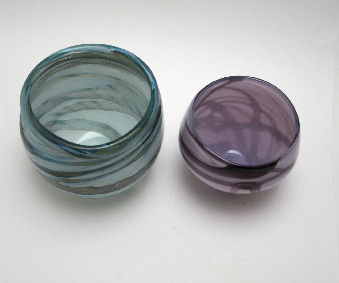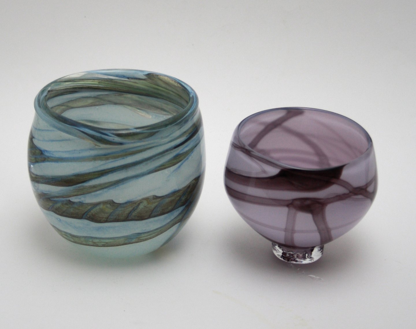 Tv. Skål i blå og grønne nuancer/striber. Utydelig signatur. Højde 12 cm. Øverste diameter 12 cm. Pris: 300 kr.