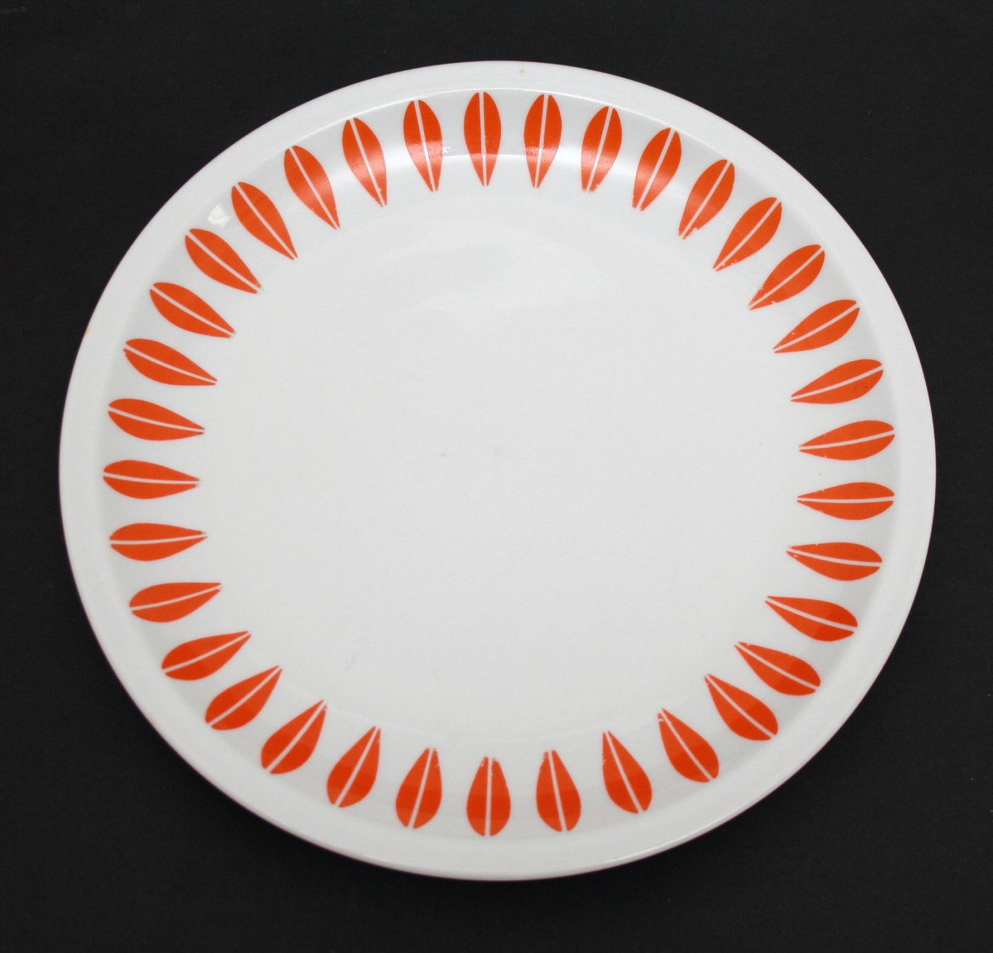 Lyngby, Dan ild, Lotus orange middagstallerken. Designet af Greta Prytz Kittelsen. Diameter 24 cm. Almindelig brugsslid i form af overflade ridser. Pris: SOLGT