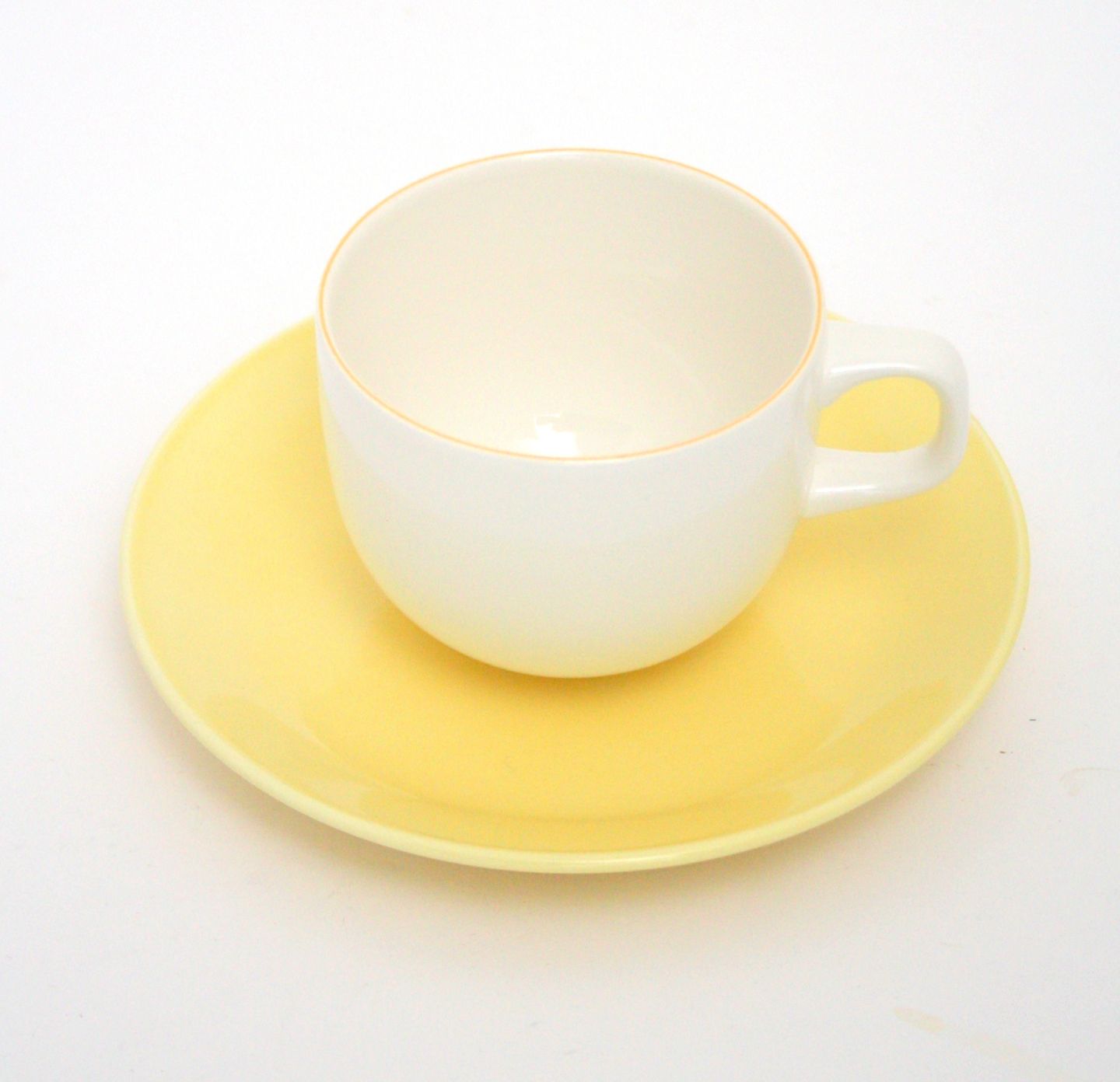 4 All seasons kaffekop med gul kant og underkop, Royal Copenhagen. Dek. nr. 072, 1 sortering, diameter 8 cm. Højde 6,5 cm. Pris: SOLGT