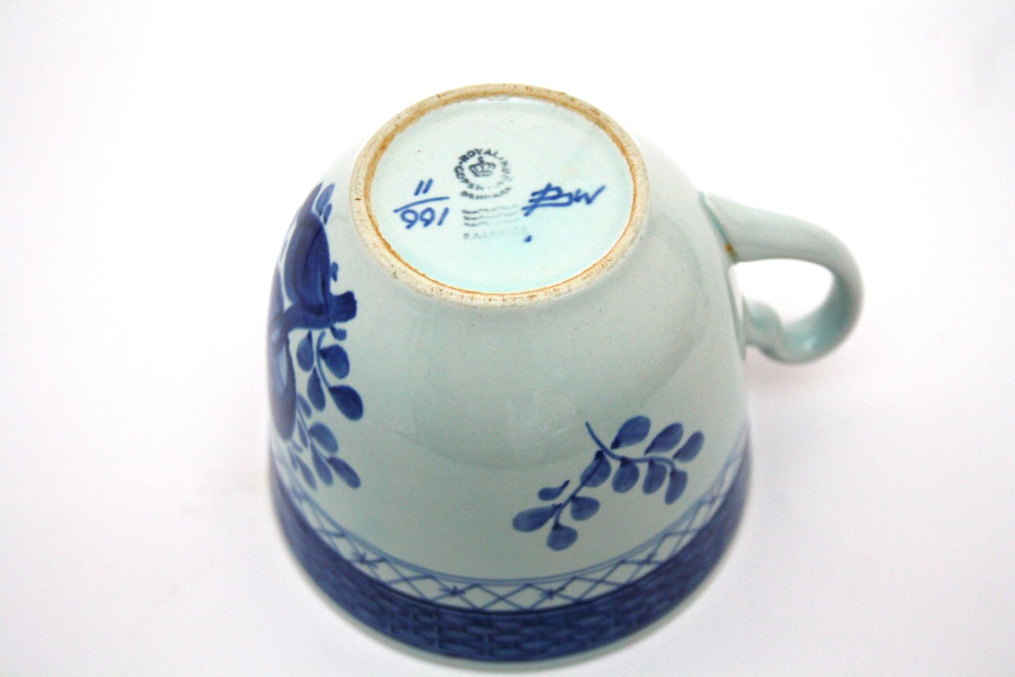 Royal Copenhagen, Tranquebar lyseblå fajance med mørkeblå tulipan og flettet bort designet af Christian Joachim. Produceret fra 1914 til 1969 på Aluminia derefter videreført hos Royal Copenhagen.