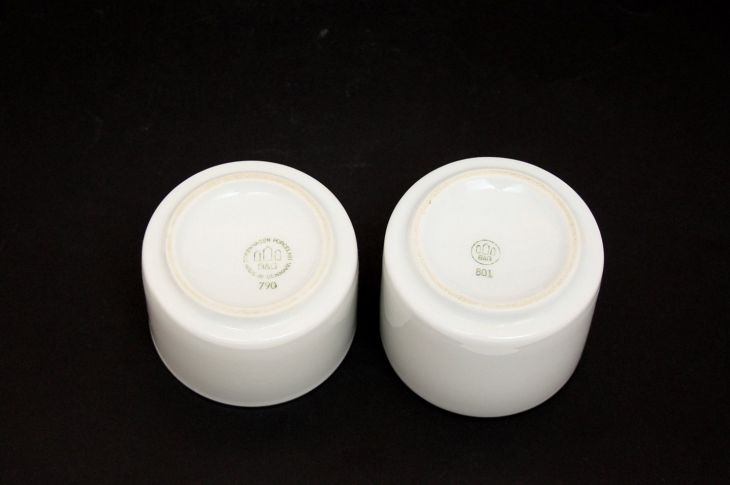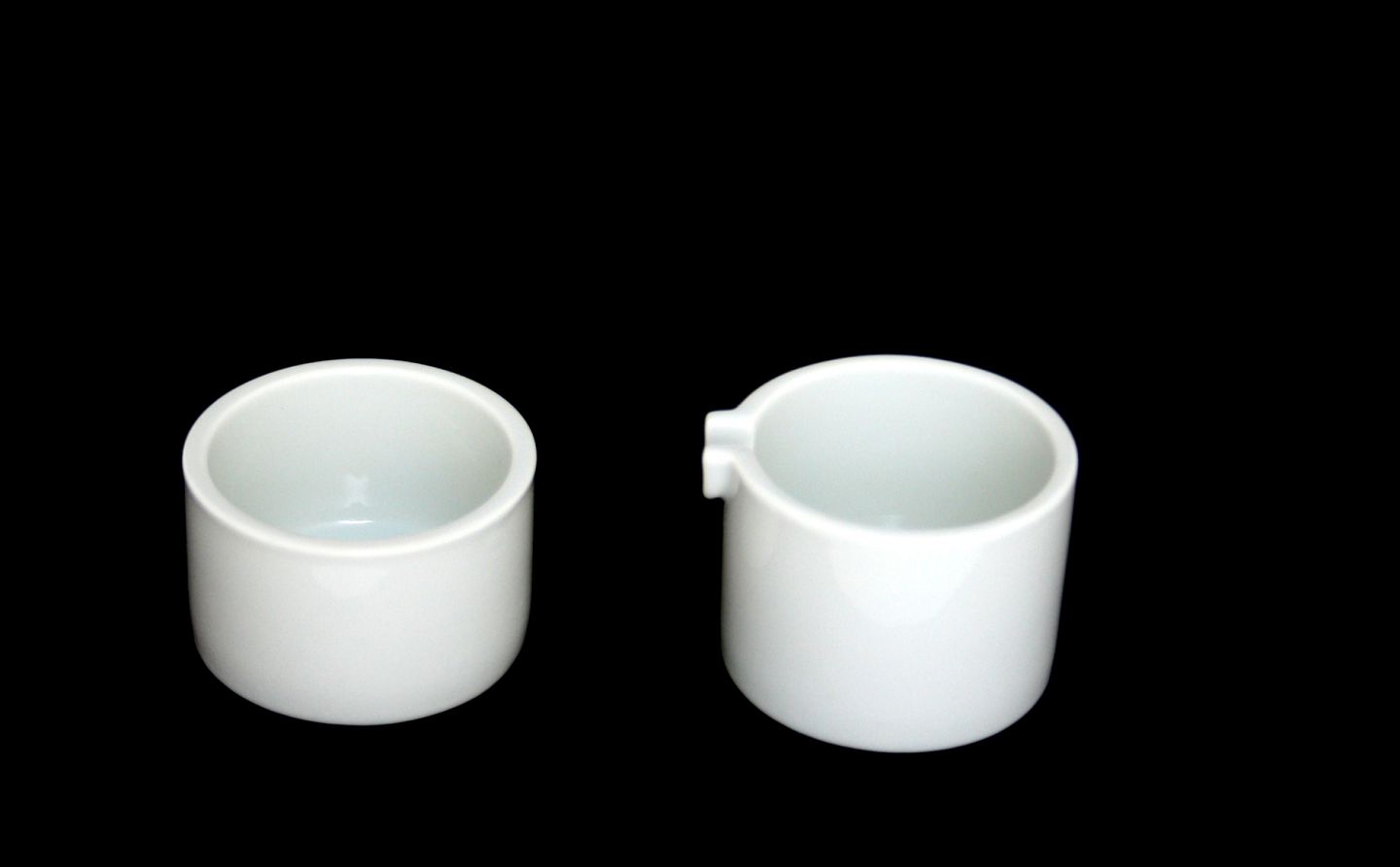 Bing & Grøndahl, Hank sukker og fløde sæt. Designet af Erik Magnussen i 1977. I. sortering. Sukker. Nr. 790. Højde 4,5 cm. Diameter 6,5 cm. Fløde. Nr. 801. Højde 5,3 cm. Diameter 6,5 cm. Pris: 300 kr. pr. sæt. Lager: 3 sæt