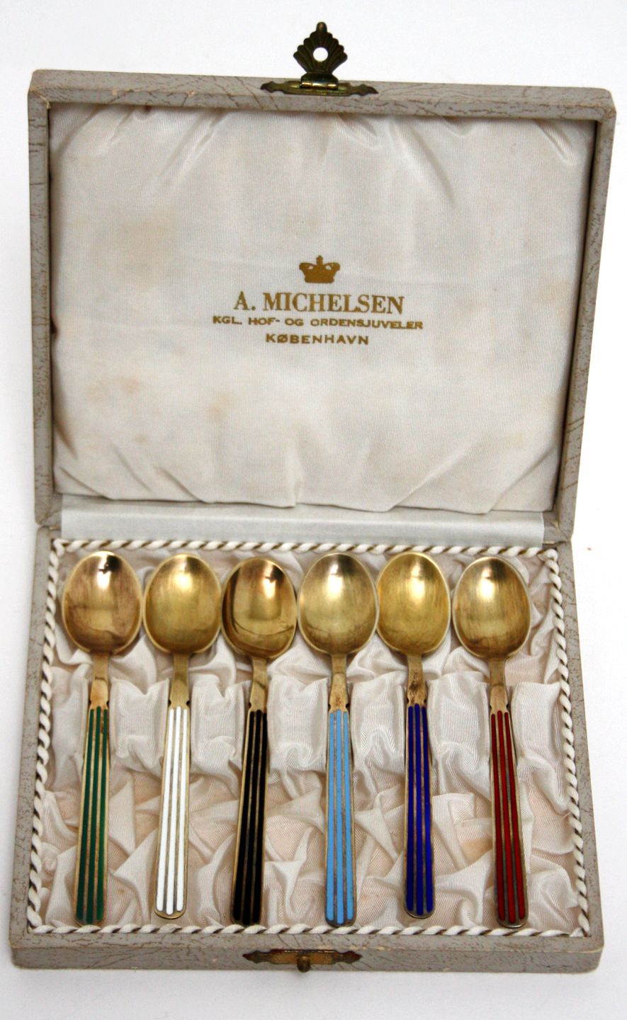 A. Michelsen, kaffeskeer i forgyldt sterlingsølv med emaljeskaft. Indgraveret F. Længde 10 cm. 6 stk. i original æske. SOLGT