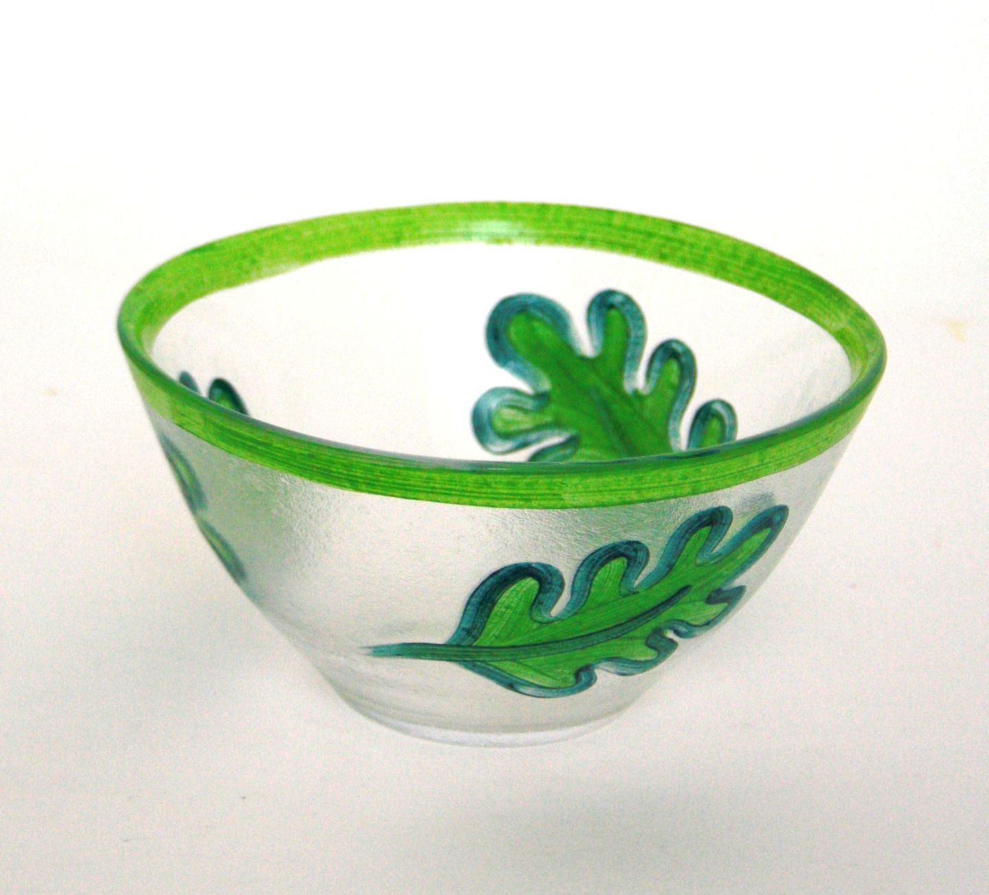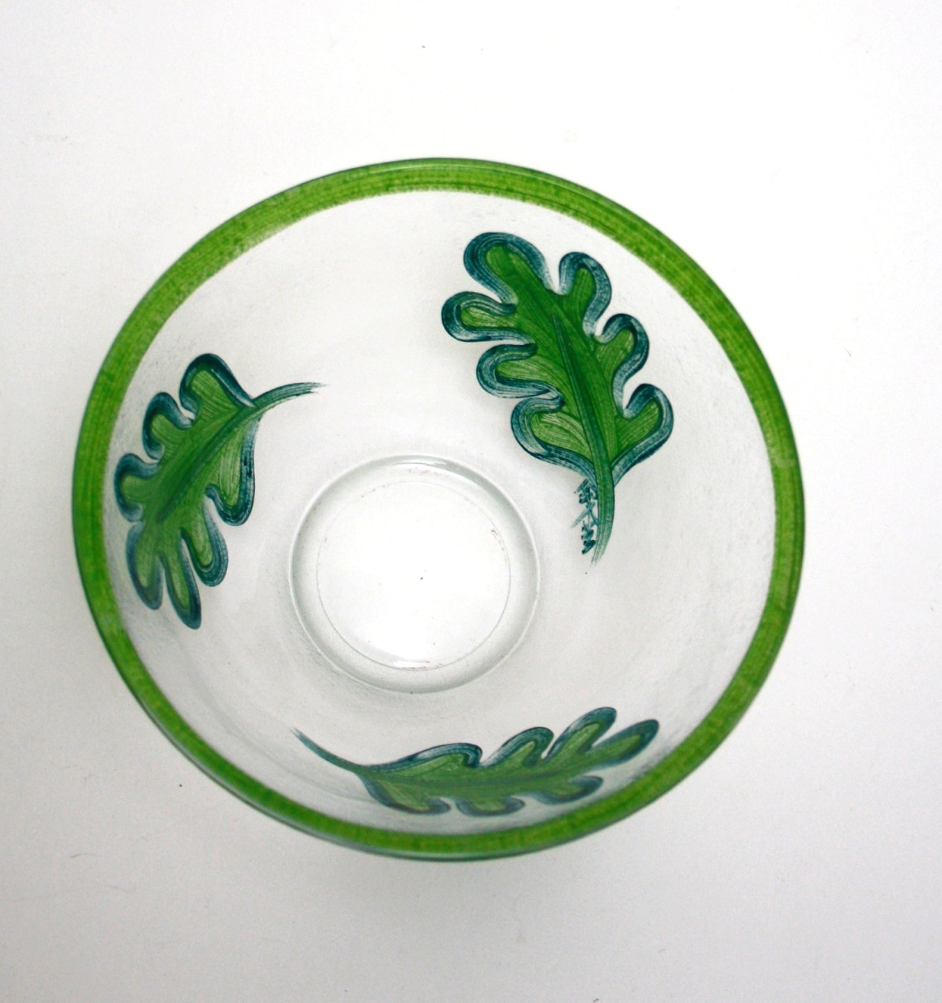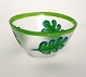 Kosta Boda, Sverige, Ruccola skål med håndmalede salatblade. Designet af Martti Rytkönen i 2003. Højde 7,5 cm. Diameter 15,5 cm. Pris: 275 kr.