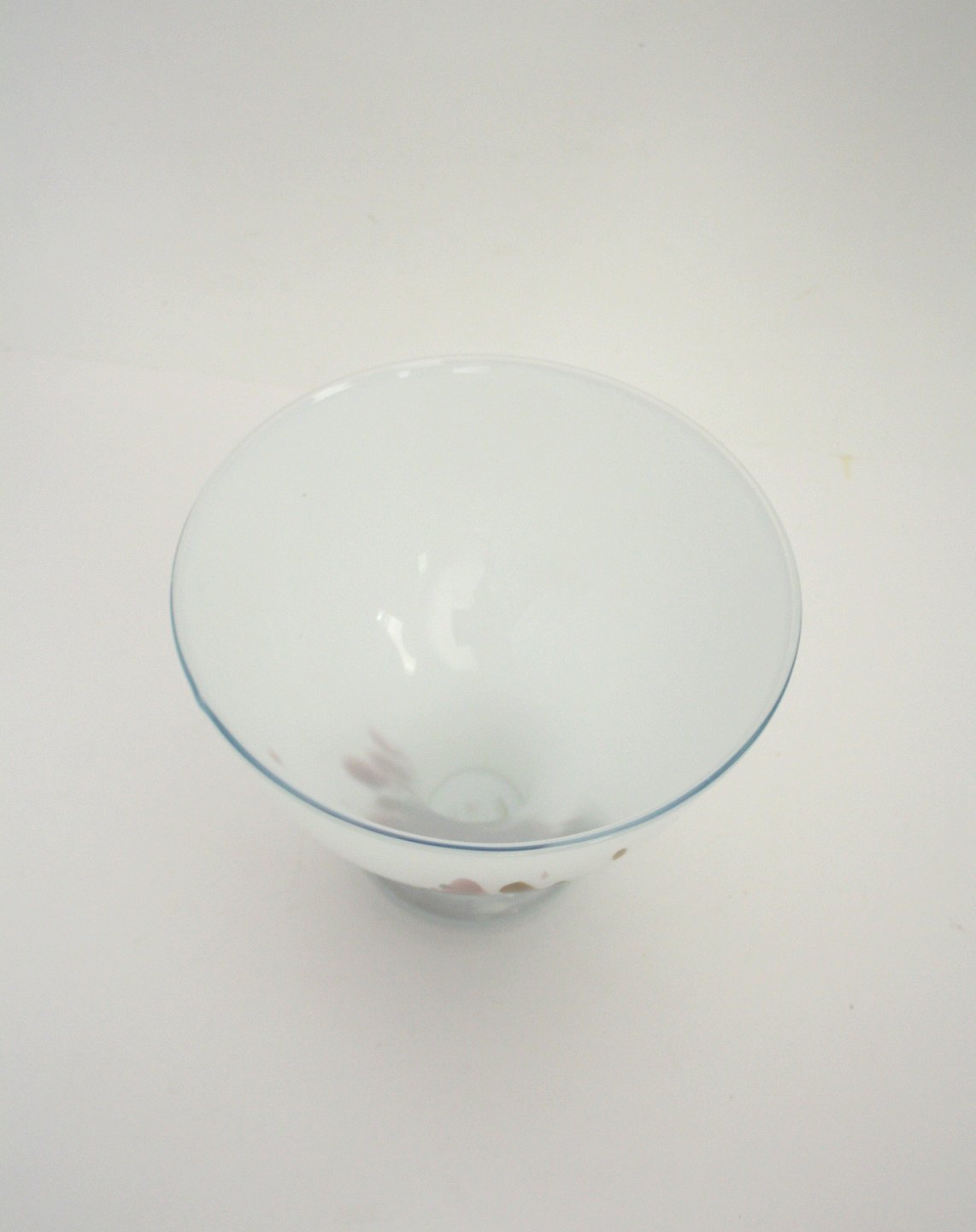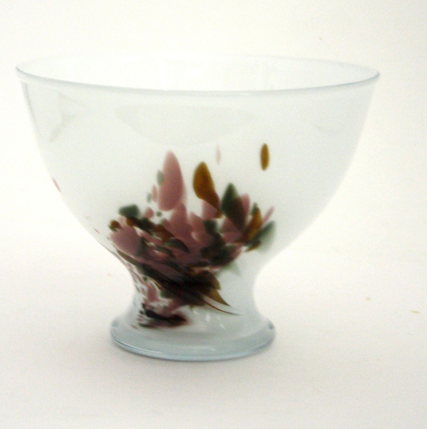 Holmegaard, Najade skål, Opal hvid med farvet glasstykker. Designet af Per Lütken. Diameter 20 cm. Højde 15,5 cm. Ikke signeret. Pris: 775 kr.