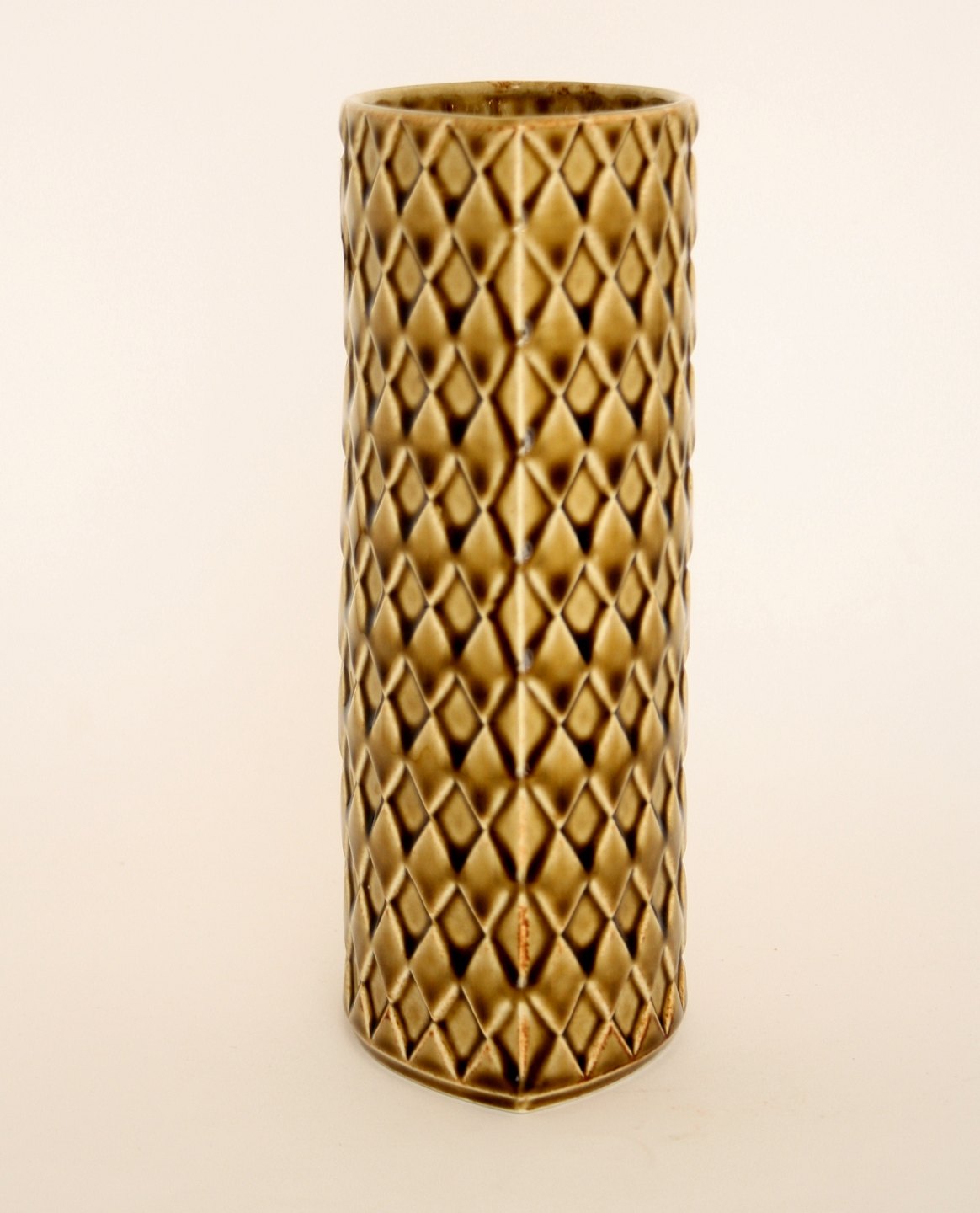 Arabia, Finland, Harlekiini vase i sennepsgul glaseret porcelæn. Designet af Kaarina Aho i 1960'erne. Formnr. 379/4. Højde 21 cm. Længde 12 cm. Bredde 7,5 cm. Flot stand. Pris: solgt