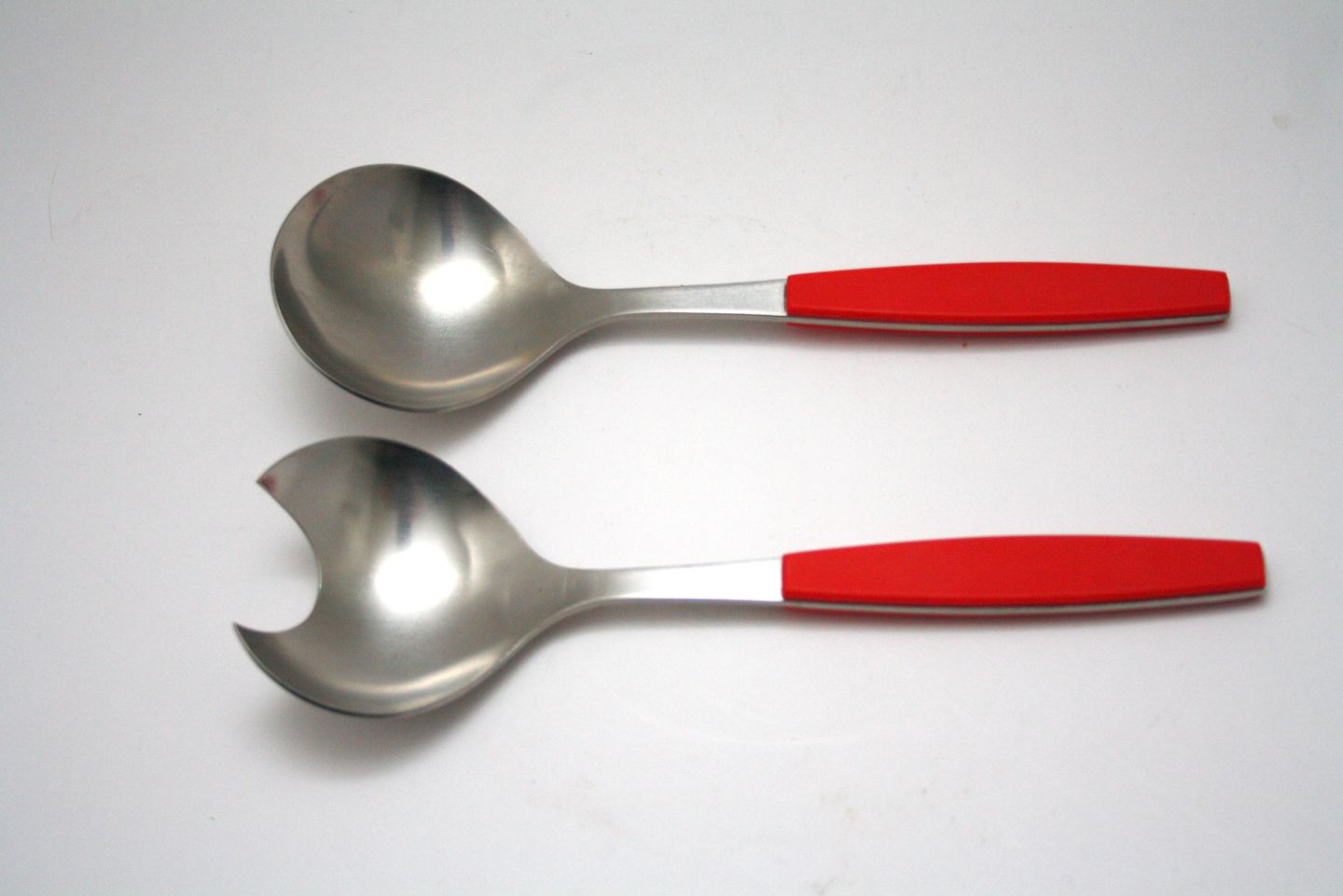 Georg Jensen, Strata salatbestik rustfrit stål med rødt skaft. Designet af Henning Koppel