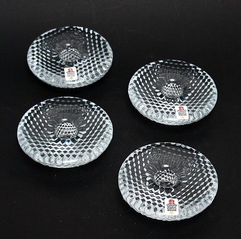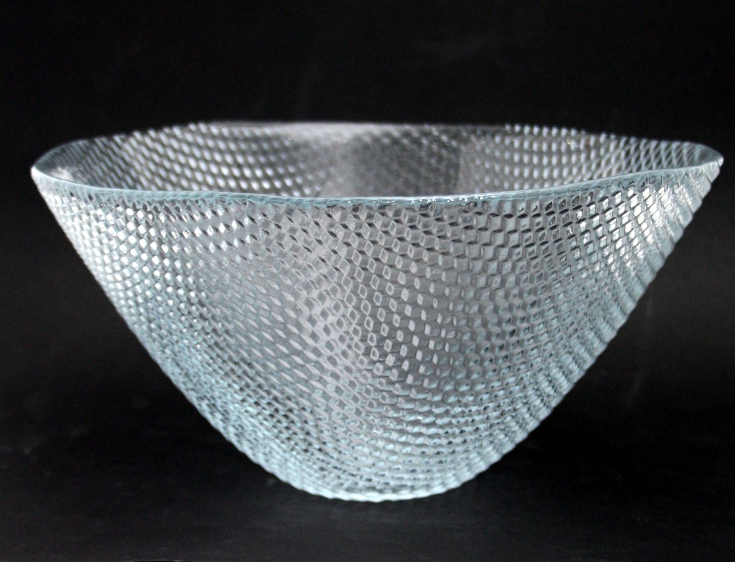 Holmegaard, Trigona klar skål. Designet af Torben Jørgensen i 1988 for Royal Copenhagen. Centrifugeret serie, glat indre og kube mønstret yderside. Er produceret i klar, lilla, olivengrøn og blå glas.