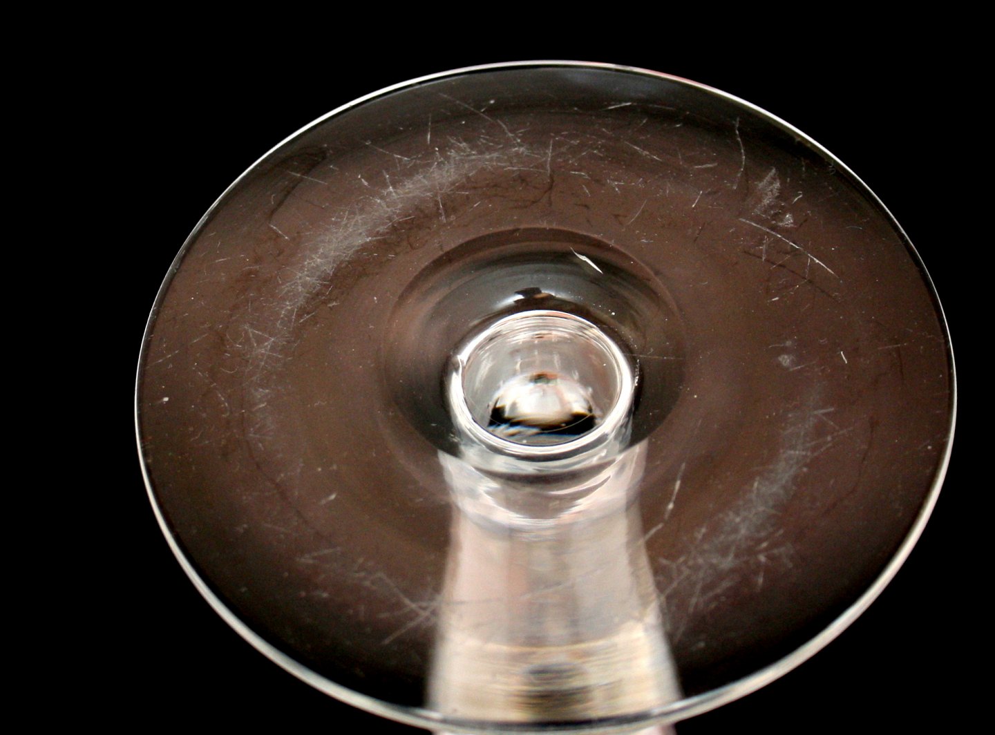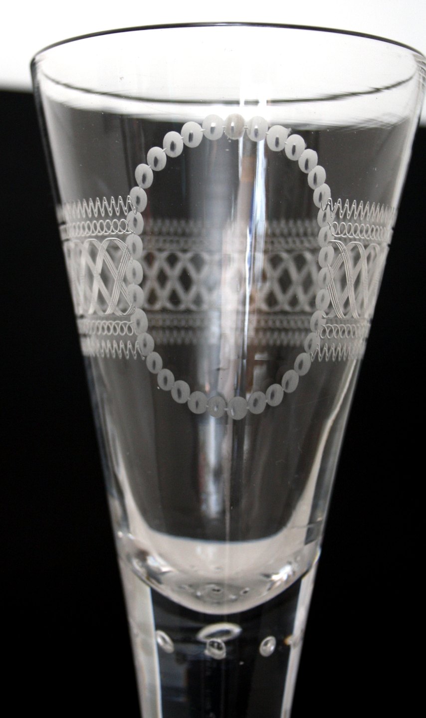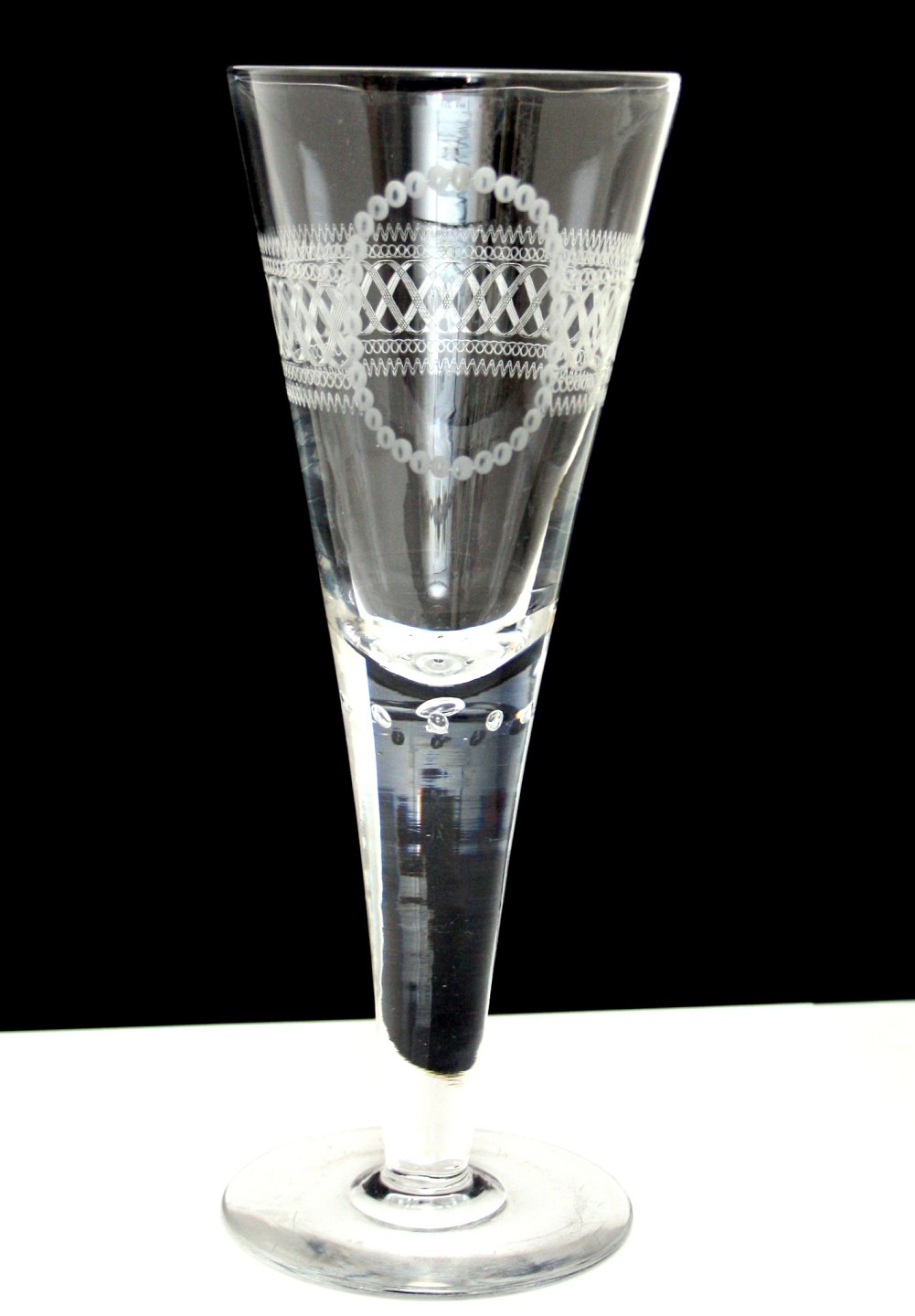 Kastrup Glasværk 1910, Pokal med guillocheret bort på kummen og ovalt felt med plads til gravering. Det er en sjældenhed, at der ikke er initialer eller skrevet i dette felt, da pokalen ofte er brugt til festlige begivenheder, med indgravering. Glat stilk med luftperler. Slitage under foden. Højde 28 cm. Pris: SOLGT