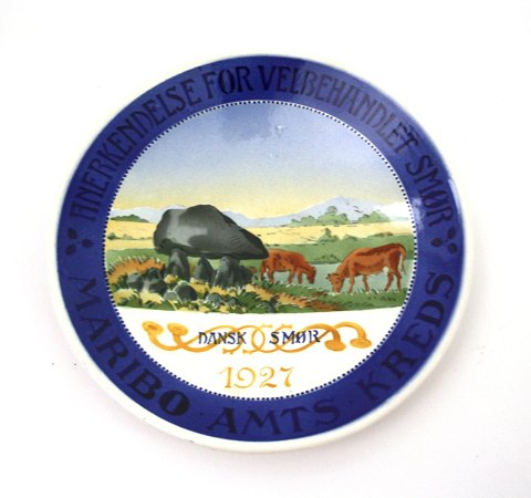 Københavns Fajancefabrik Danmark/Aluminia. Mejeriplatte, Anerkendelse for velbehandlet smør. Maribo Amts Kreds 1933. Luftmalet dekoration efter tegning af Oscar Willerup.