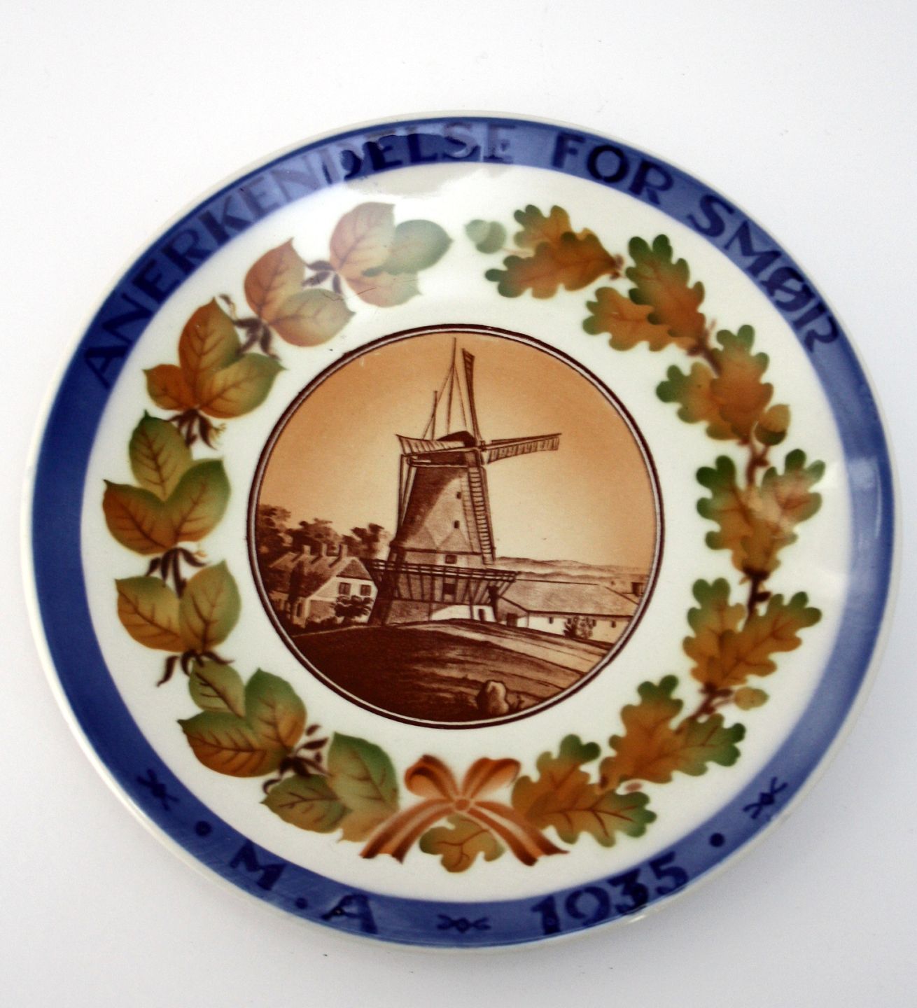 Aluminia. Mejeriplatte, Anerkendelse for velbehandlet smør. Maribo Amts Kreds 1935. Luftmalet dekoration efter tegning af Oscar Willerup.