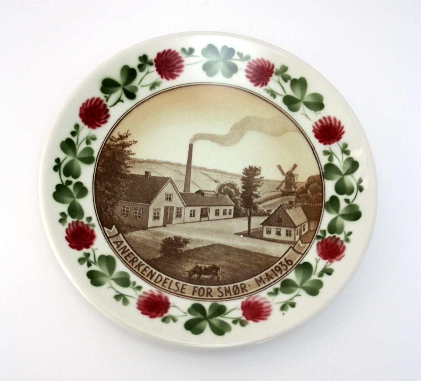 Aluminia. Mejeriplatte, Anerkendelse for velbehandlet smør. Maribo Amts Kreds 1936. Luftmalet dekoration efter tegning af Oscar Willerup.