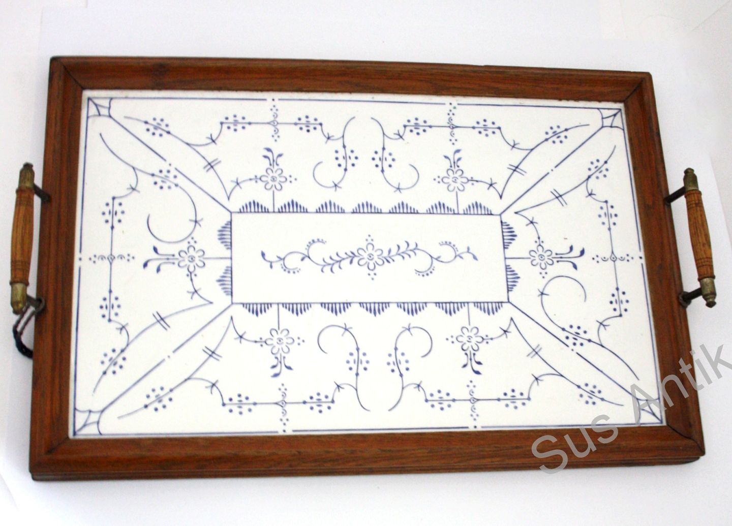 Musselmalet serveringsbakke tysk eller engelsk. Fajanceoverdelen er i flot stand uden krakelering og revner, men med få overfladeridser. Træbund med med hanke er også velholdt og flot stand. Nr. trykt på bagsiden 12 I 28 44. Længde 49 cm. Bredde 31,5 cm. Bakken er monteret med snor til ophæng. Pris: SOLGT