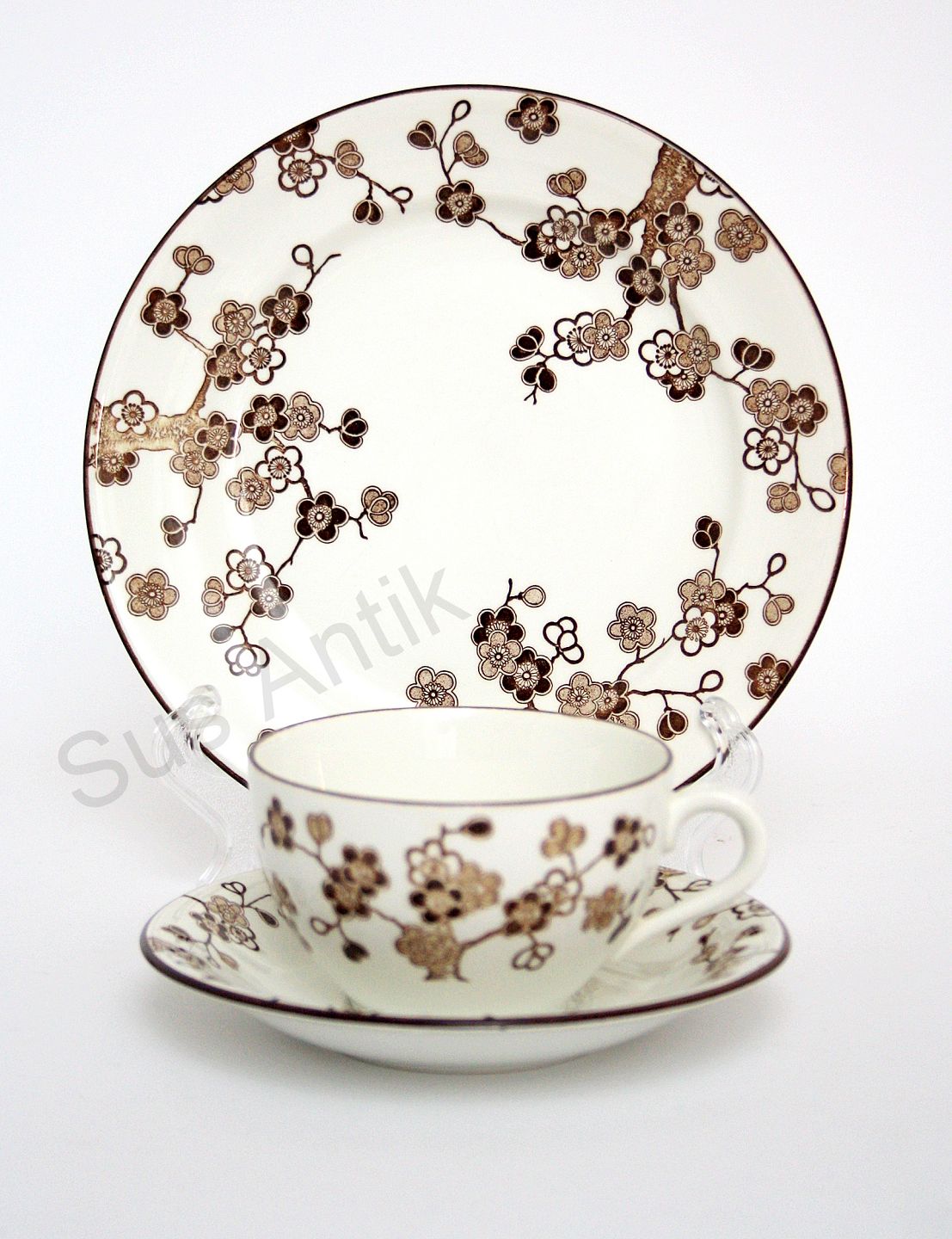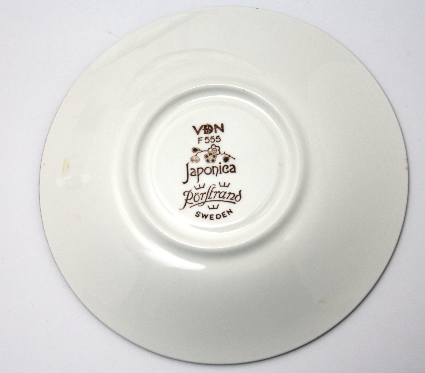 Rørstrand, Japonica designet af Jackie Lynd. Mærke VDN F555, Japonica, Rørstrand Sweden. Kop. Højde 5 cm. Diameter 8,5 cm. Underkop Diameter 13 cm. Pris: SOLGT Ekstra underkop. Pris: SOLGT Kagetallerken. Diameter 17,5 cm. Pris: SOLGT