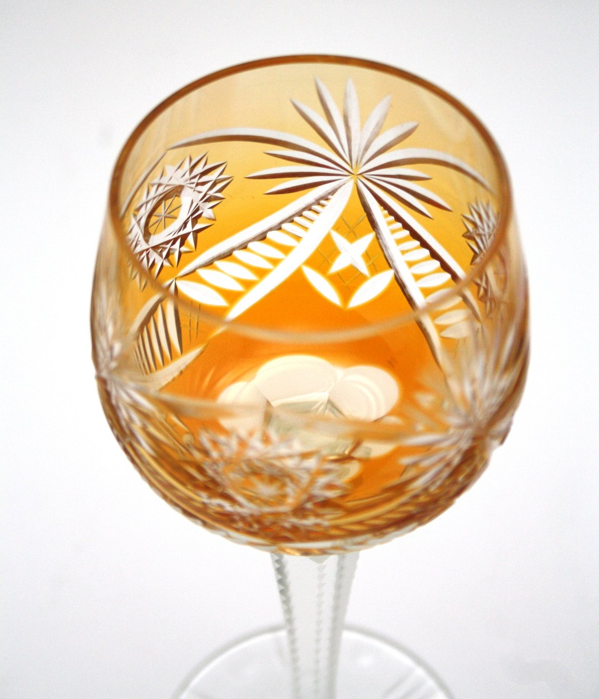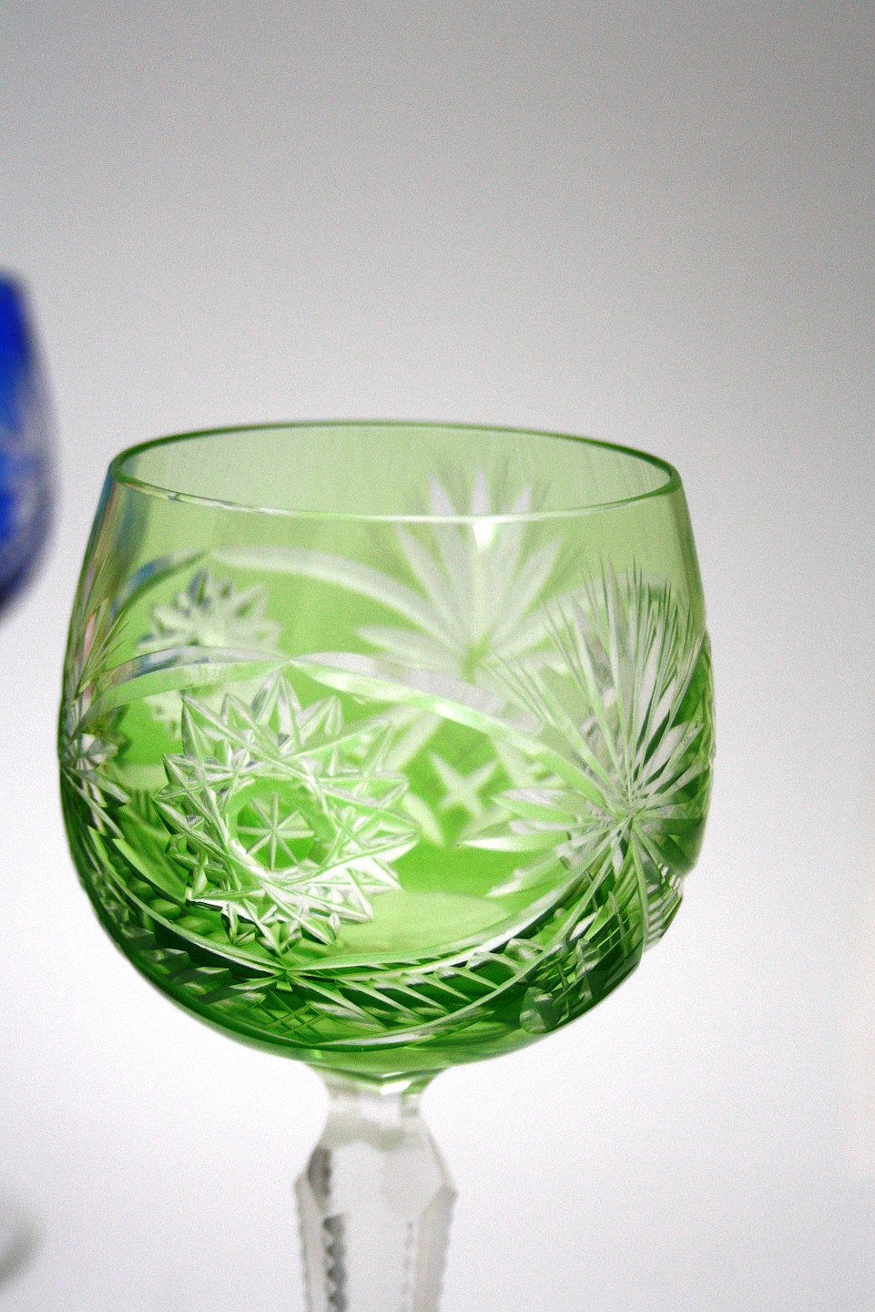 Bøhmisk krystalglas i sarte farver med slebet kumme, stilk og fod. B-7-21. Højde 18,5 cm. Pris: SOLGT Orange. Lager: 0 Rosa. Lager: 0 Blå. Lager: 0 Grøn. Lager: 0