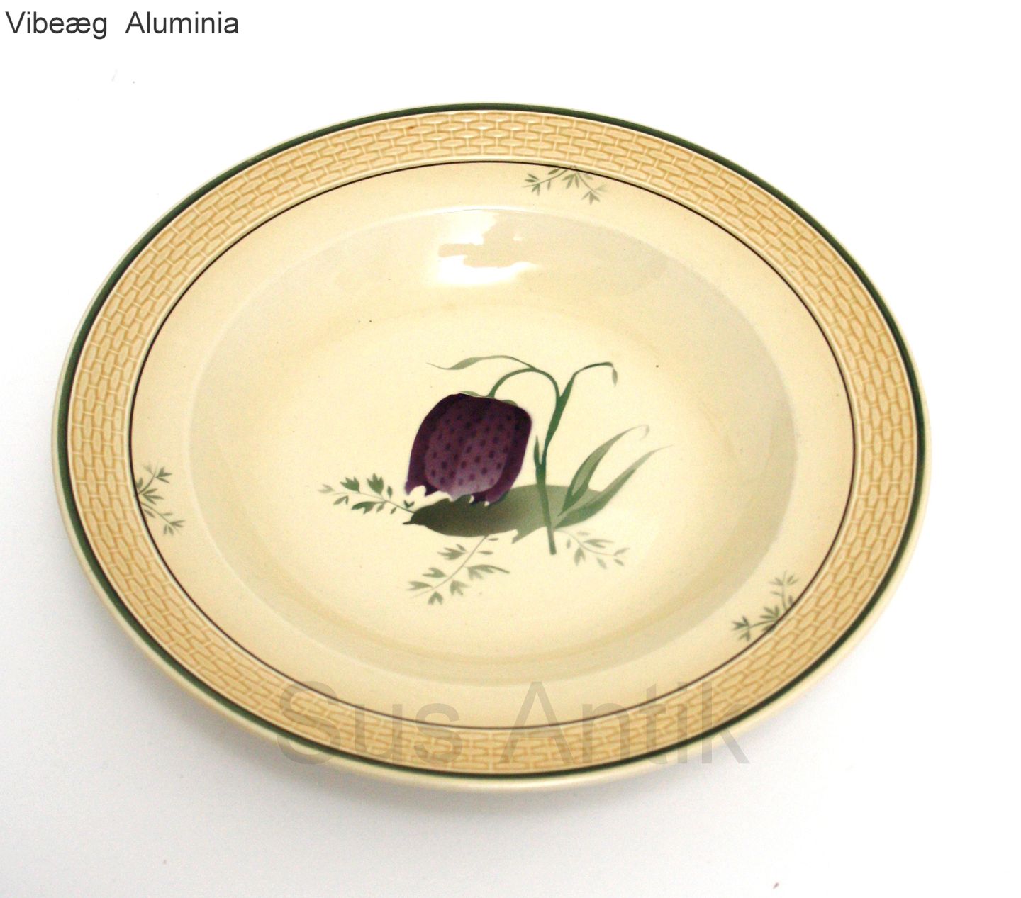 Aluminia fajance, Vibeæg. Motiv violet og grøn vibeæg blomst. Flettet kant. Formgivet af Nils Thorsson. Produceret i perioden 1934-1967.
