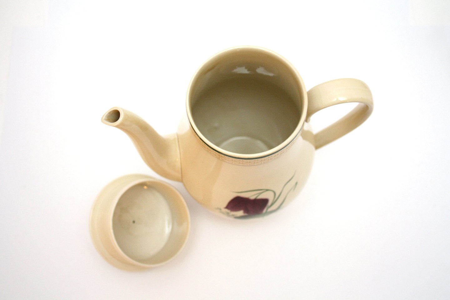 Aluminia fajance, Vibeæg. Motiv violet og grøn vibeæg blomst. Flettet kant. Formgivet af Nils Thorsson. Produceret i perioden 1934-1967. Kaffekande. Højde 20,5 cm. Længde 21 cm. Flot stand. Pris: SOLGT