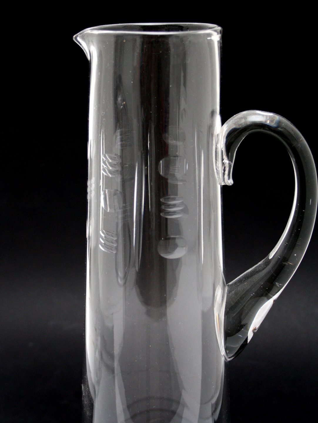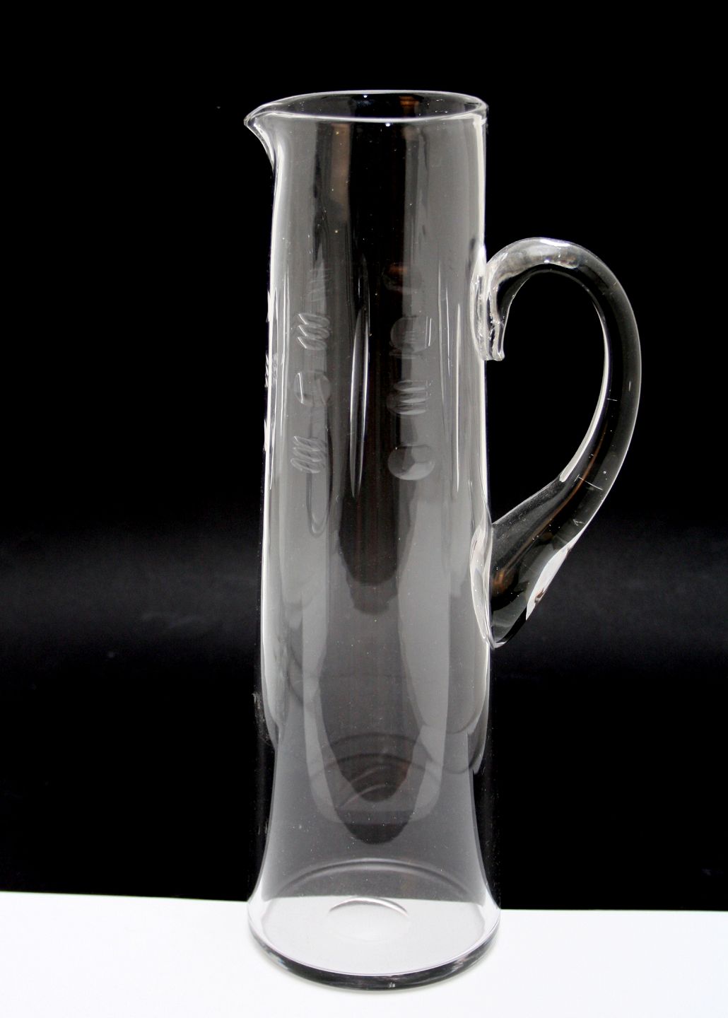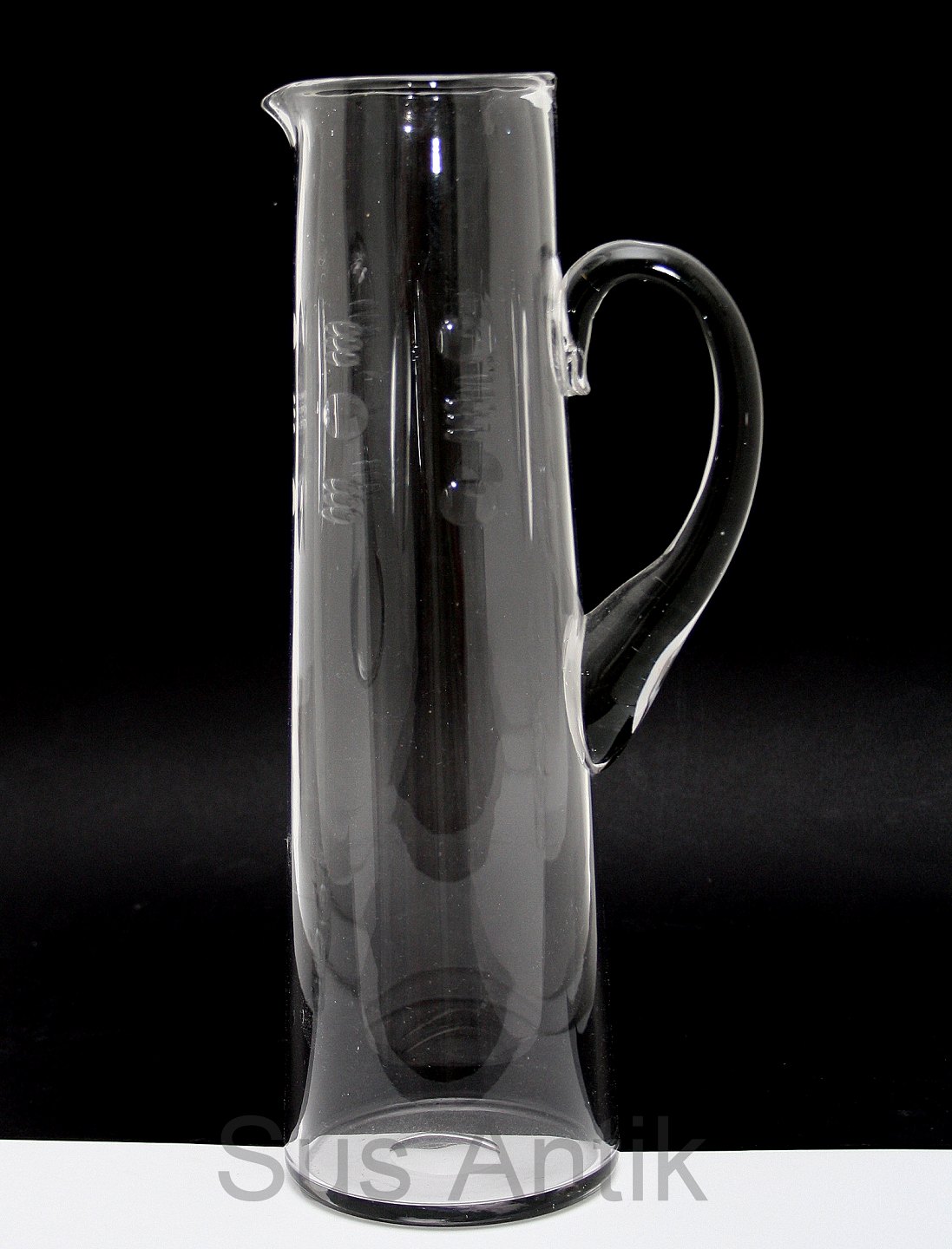 Høj slank glaskande med enkelte slibninger og rundslebet bund. Højde 33 cm. Fin stand. Pris: 375 kr.