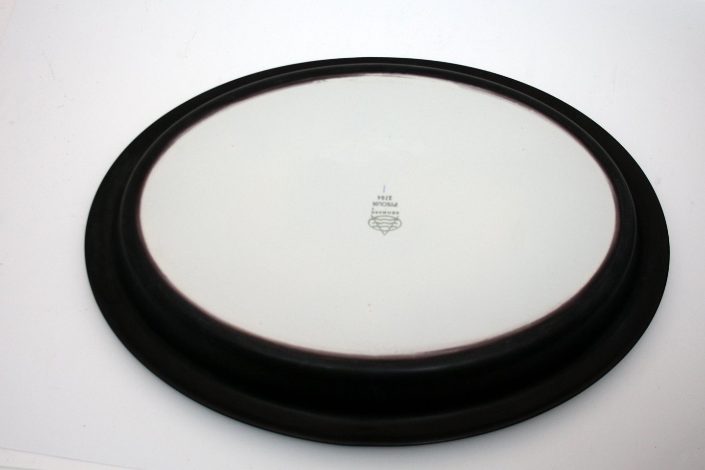 Aluminia, Pyrolin, Stort ovalt fad med matsort glasur udvendig og gråhvid glasur indvendig. Ildfast ovnserie designet af Ingvar Olsen i 1959. Nr. 2784. Længde 38 cm. Bredde 28,5 cm. Højde 4,5 cm. Fin stand. Pris: 425 kr.