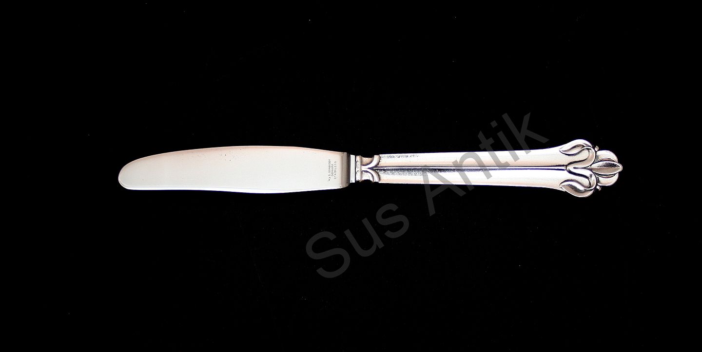 Horsens sølvvarefabrik, W&S Sørensen, Denmark, Iris sølvpletbestik. Middagskniv med blad i rustfrit stål. Længde 21,5 cm. Almindeligt brugsslid i form af ridser på bladet. Pris: 175 kr. stk. Lager: 16