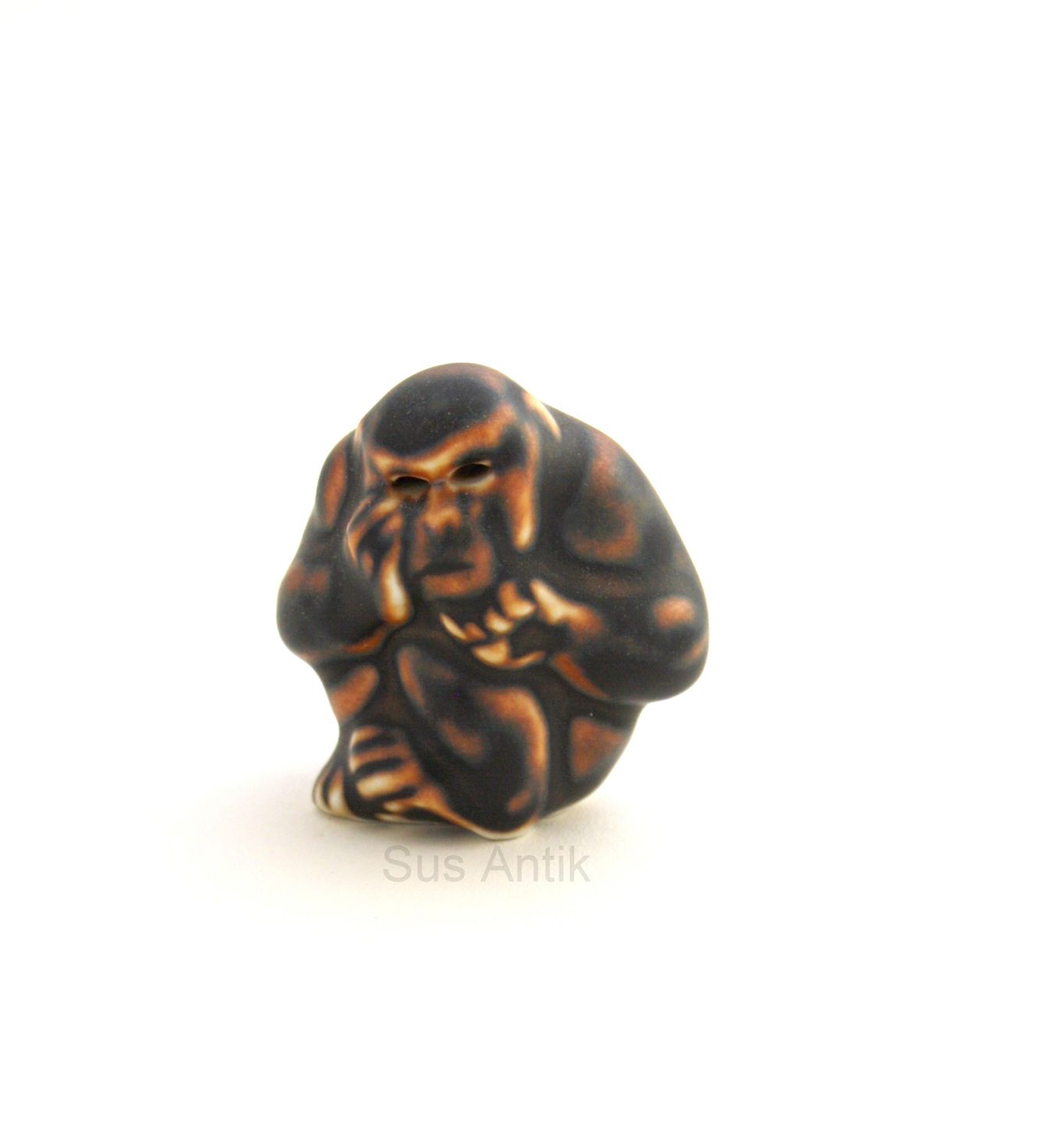 Royal Copenhagen, stoneware brun glasur. Abe lille siddende med hånd på kind. Formgivet af Knud Kyhn. Nr. 20218. Højde 5,5 cm. Pris: SOLGT