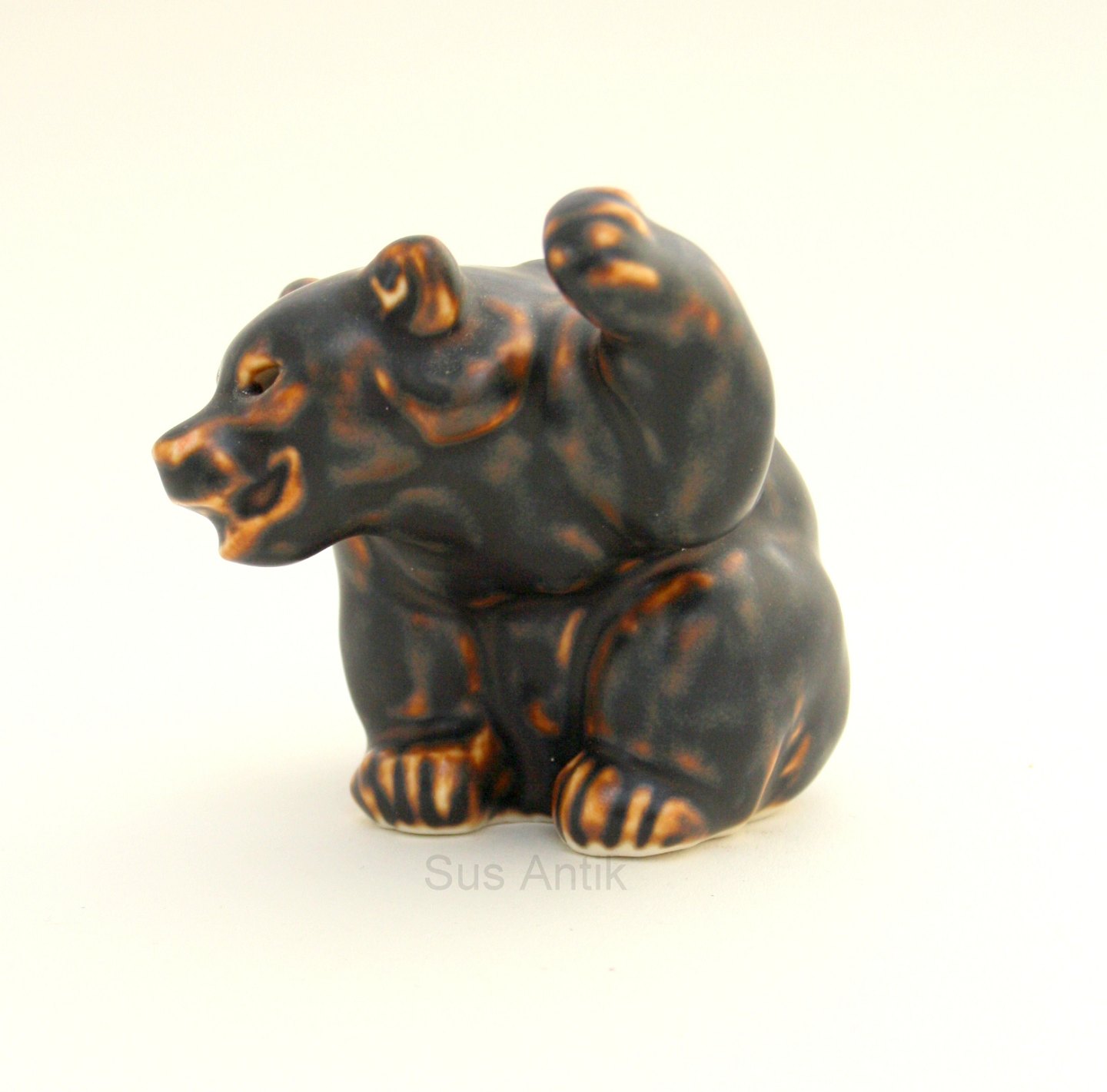 Royal Copenhagen, stoneware, brun glasur. Bjørneunge med løftet pote. Formgivet af Knud Kyhn. Nr. 21433. Højde 7,5 cm. Pris: 150 kr. stk. Lager: 5