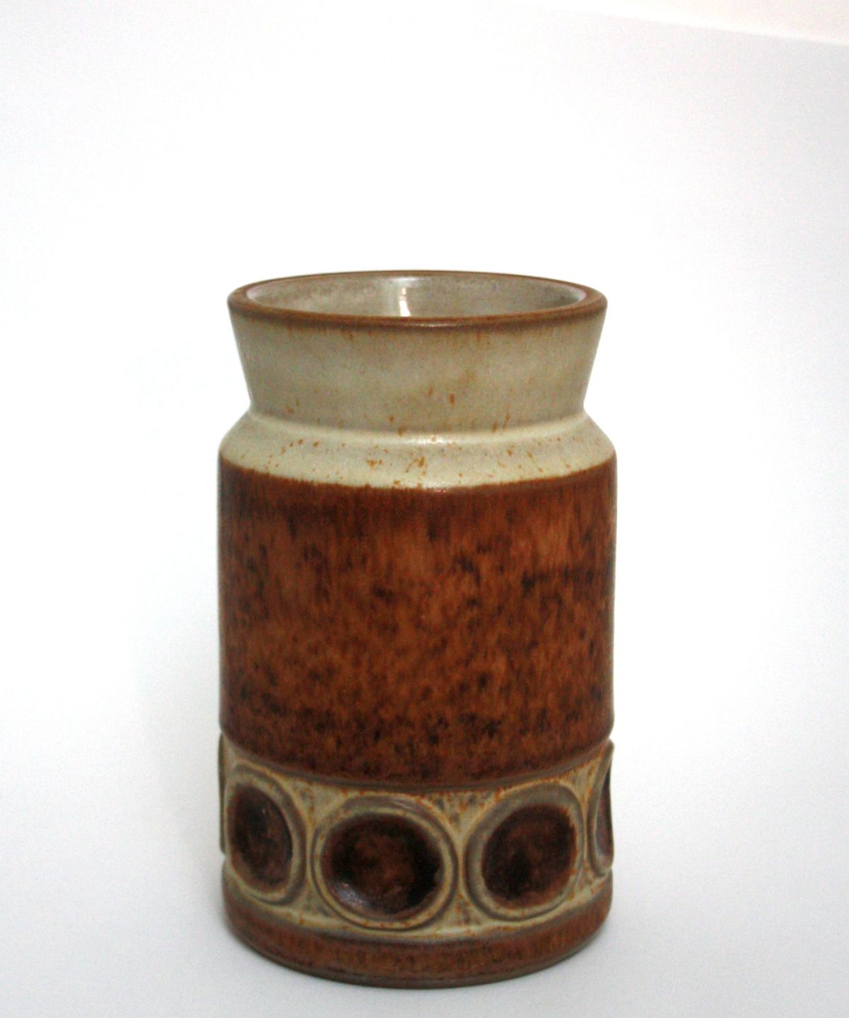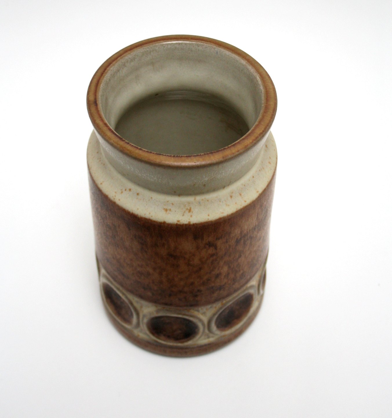 Michael Andersen, Bornholm designet af Marianne Starck. Vase i brune farver med brune bomber. Formnr. 61xx. Højde 19 cm. Øverste diameter 11 cm. Flot stand. Pris: SOLGT