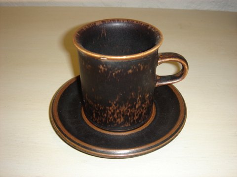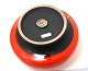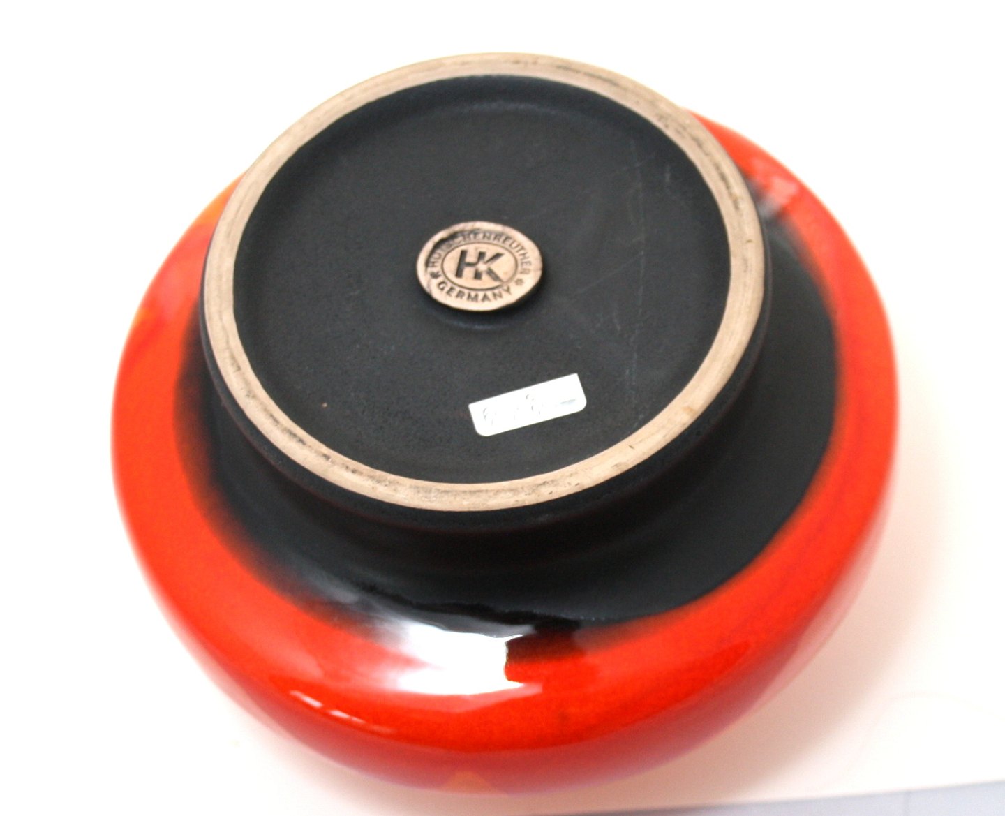 Hutschenreuter Keramik (HK), West Germany, Flad rund vase orange glasur, sort mat glasur i bund. Højde 10,5 cm. Midterste diameter 15 cm. Pris: SOLGT