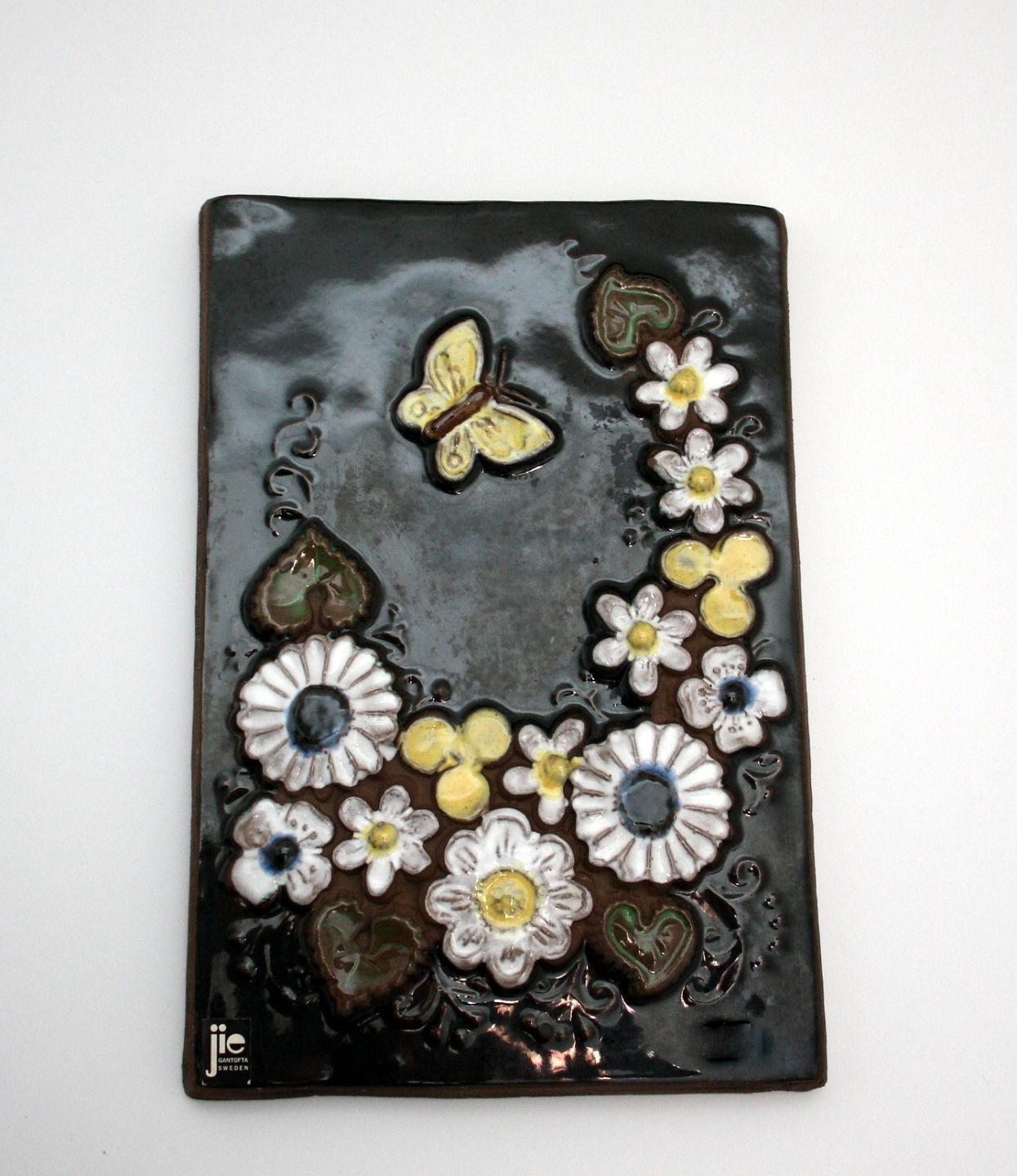 Jie-Keramik, Relief med Hvide blomster og sommerfugl. Formnr. 852. 24 x 16,5 cm. Pris: 275 kr.