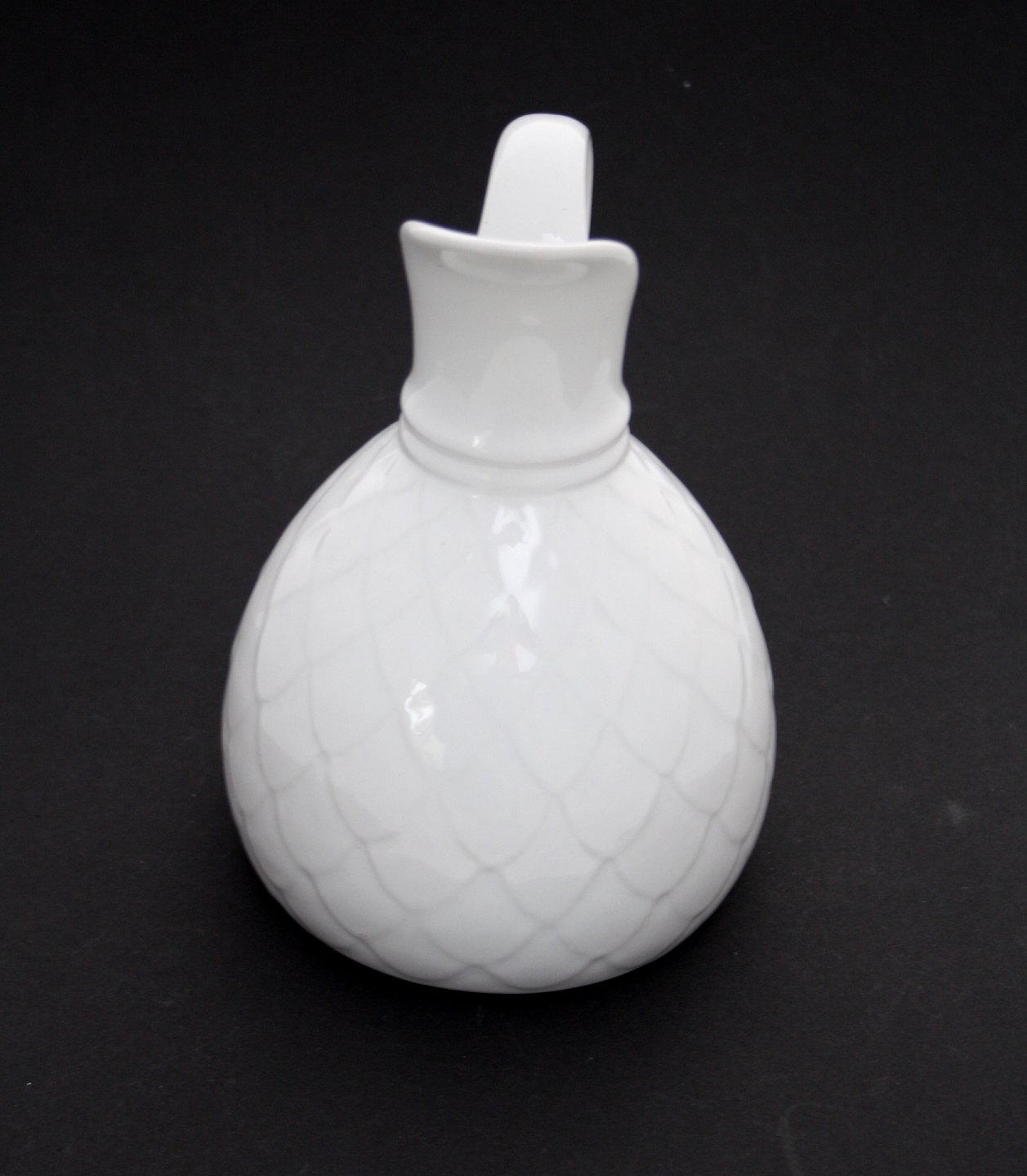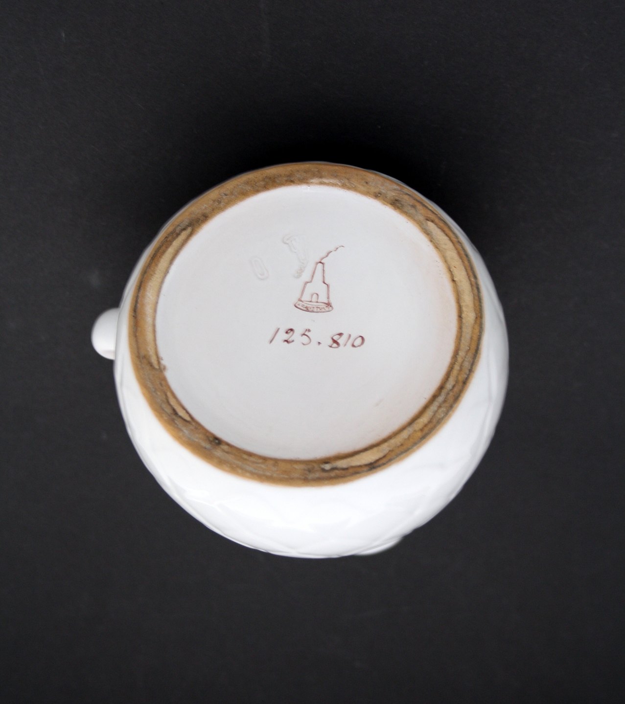 Knabstrup, Hvid kande med skelmønster. Nr. 125.810. Højde 18,5 cm. Diameter bund 12 cm. Flot stand. Pris: 425 kr.