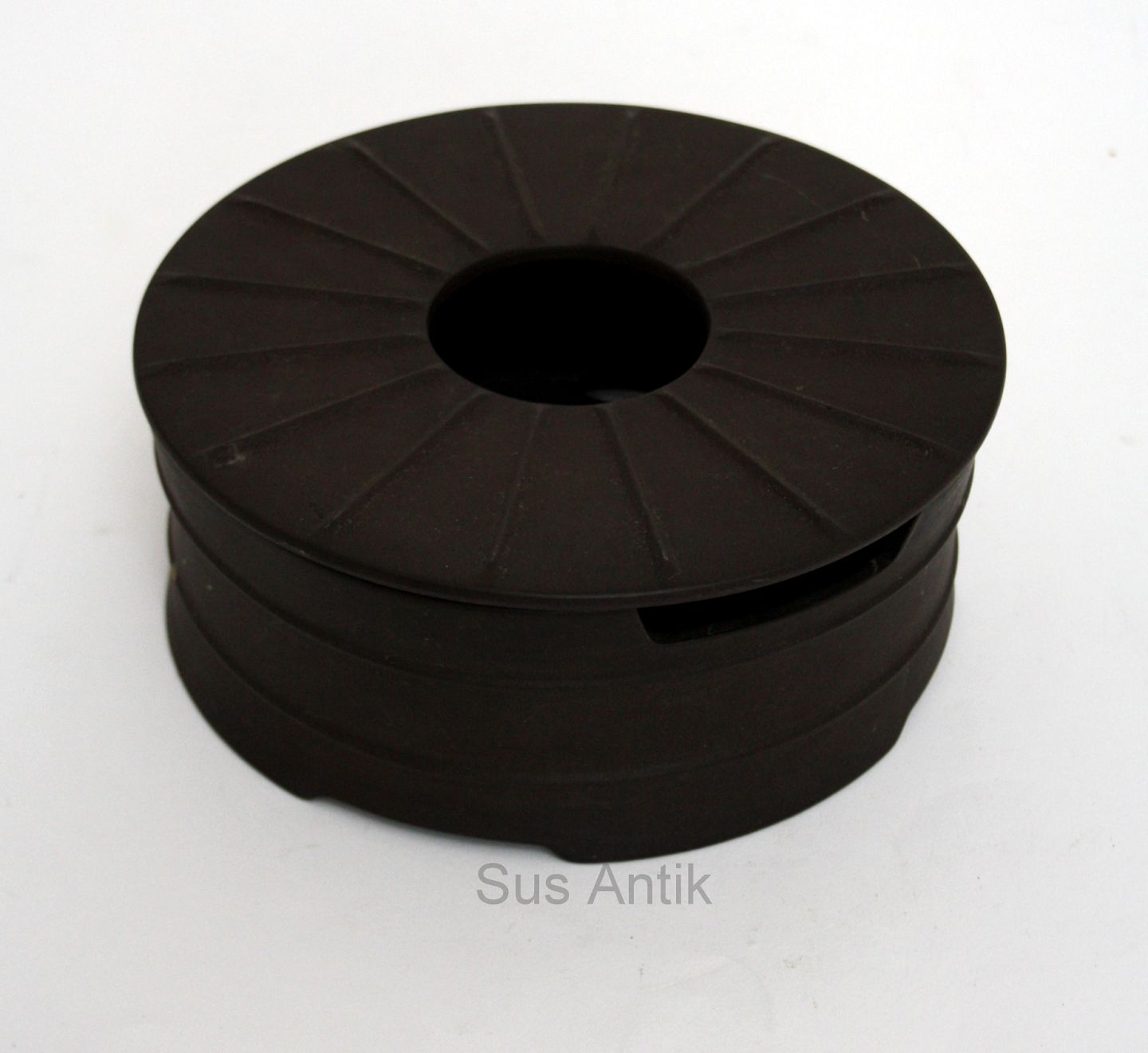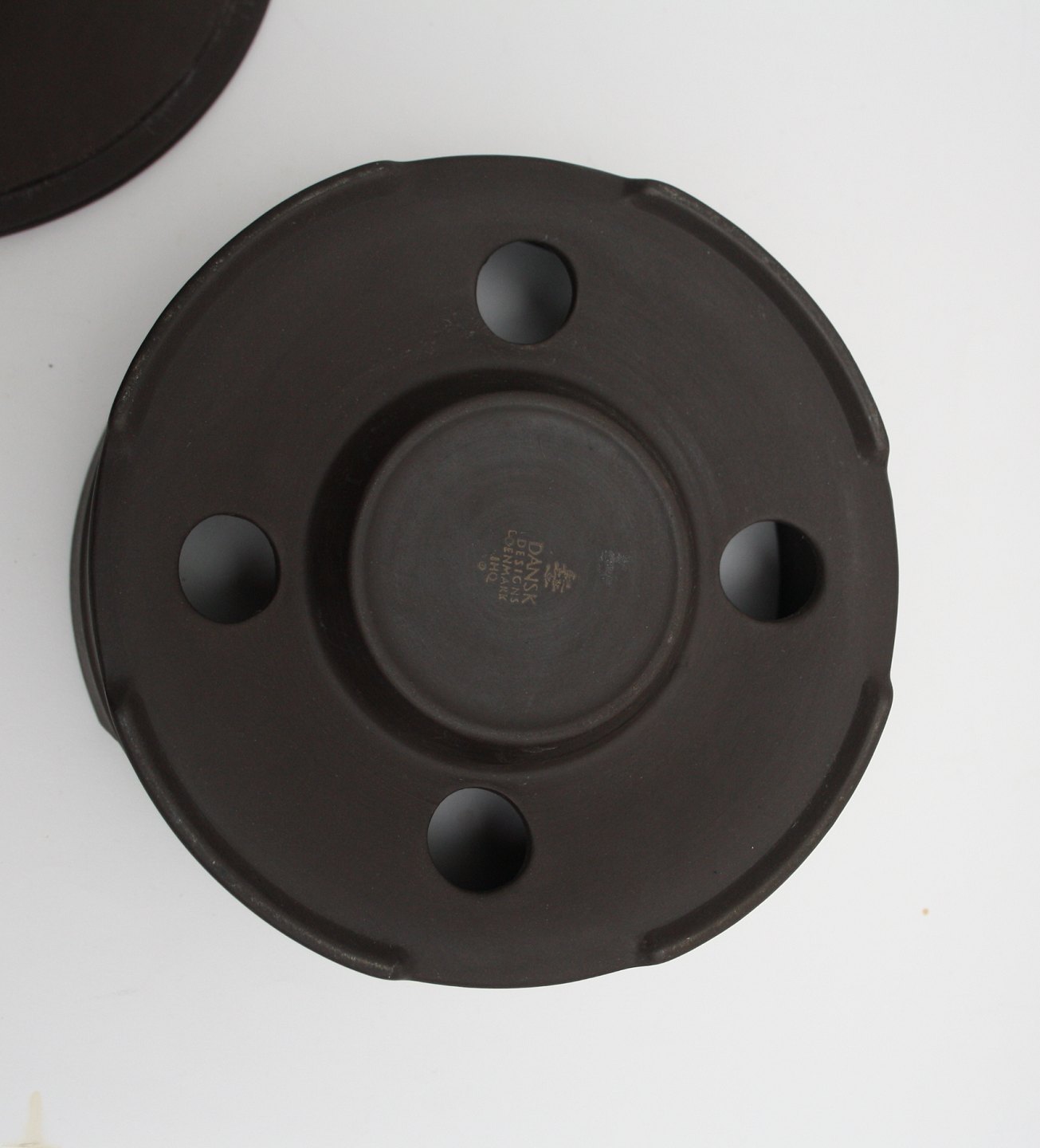 Eslau Danmark, Flamestone. Fyrfad. Indvendig hvid glasur, yderside i rå uglaseret stentøj. Designet af Jens Harald Quistgaard i 1950,erne. Signeret IHQ, Dansk Designs, Denmark. Højde 8 cm. Diameter 19,5 cm. Pris: SOLGT