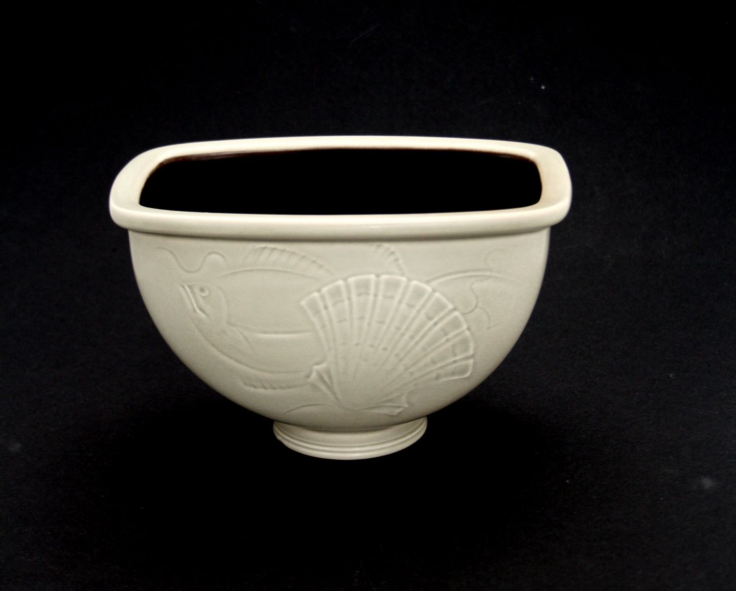 Oval skål i creme mat glasur med fiskemotiv. Nr. 1872/1602. Højde 10 cm. 17 x 10 cm. Pris: 350 kr.