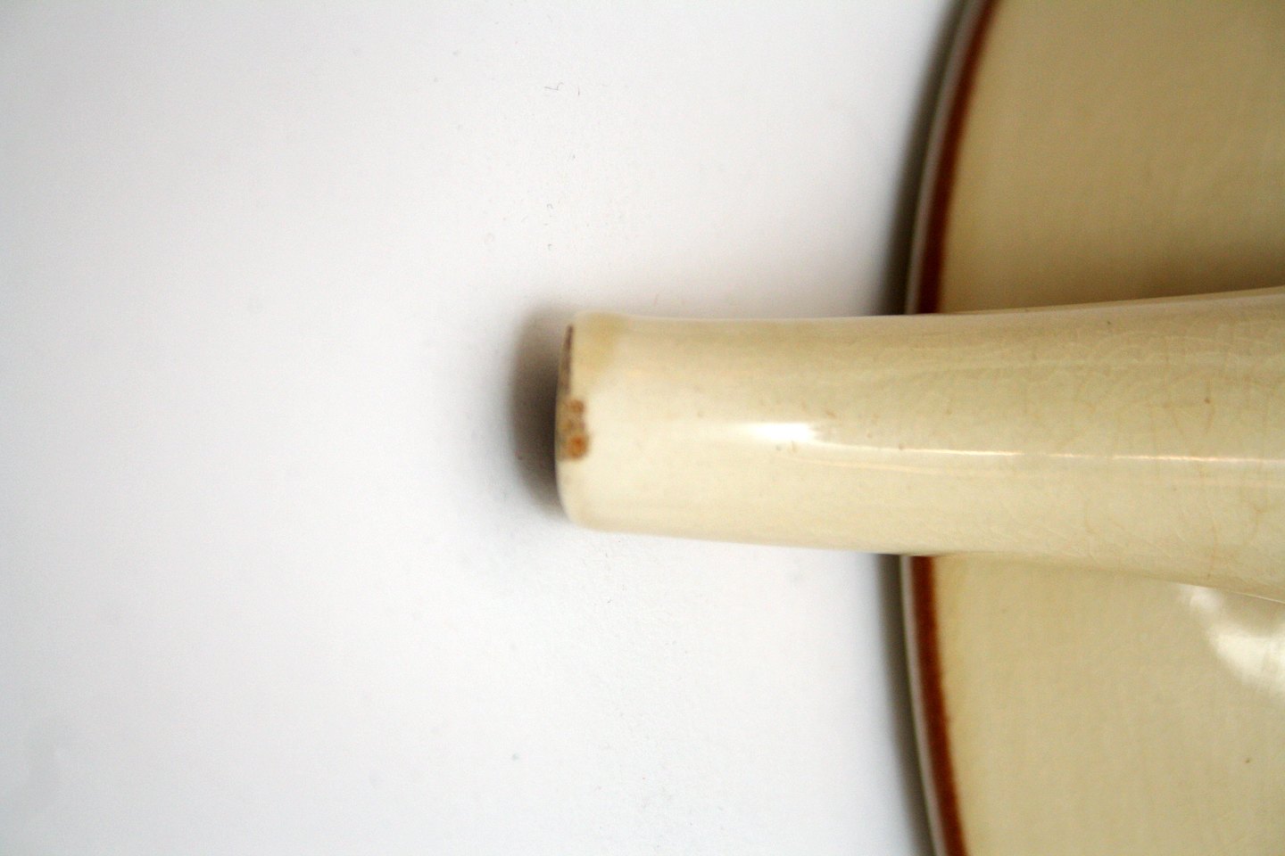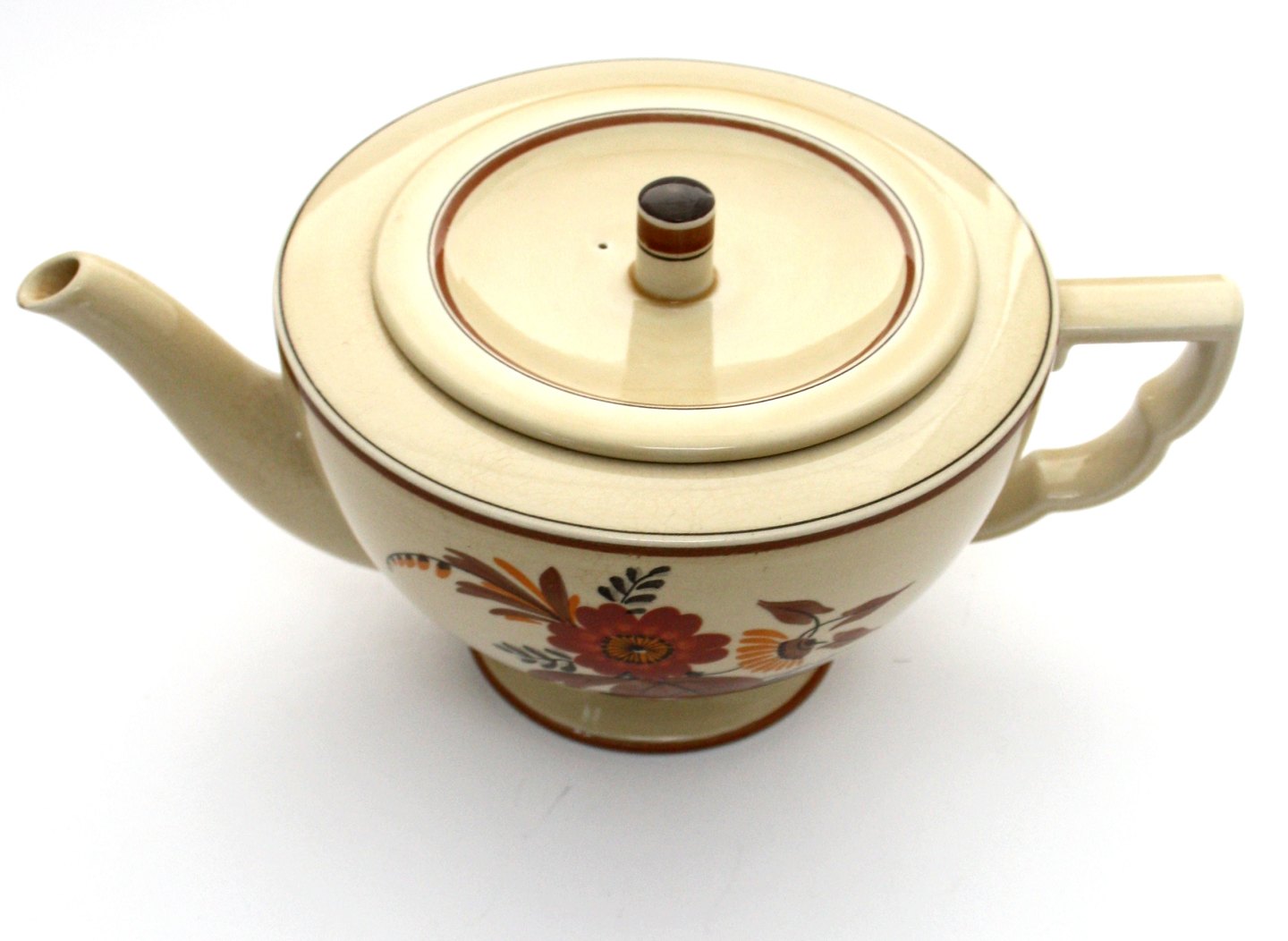 Aluminia fajance. Knud. Design Niels Thorsson. Håndmalet. Produceret i perioden 1934-1963. Tekande med låg. Højde 12 cm. Diameter 15,5 cm. Længde 25,5 cm. Lettere overfladekrakelering udvendig. Brun krakelering indvendig. Lille glasurafslag under tuden yderst. Pris: SOLGT