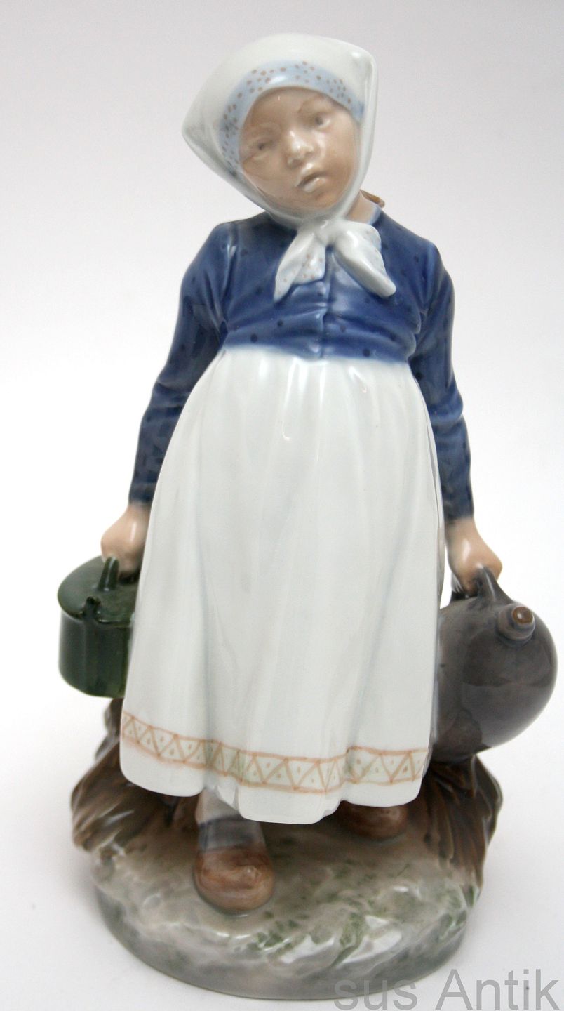 Royal Copenhagen, Bondepige med frokost, dunk og tejne. Nr. 815. Designet af Christian Thomsen. Højde 21,5 cm. Fin stand. I. sortering. Pris: 950 kr.