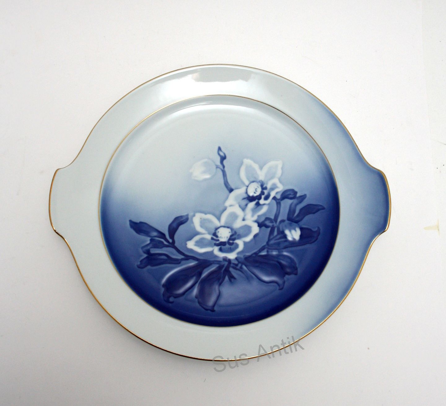 Bing & Grøndahl, Julerose med guld, Kagefad med hanke. Nr. 304. Diameter 25 cm. Længde 27,5 cm. II. sortering. Pris: SOLGT
