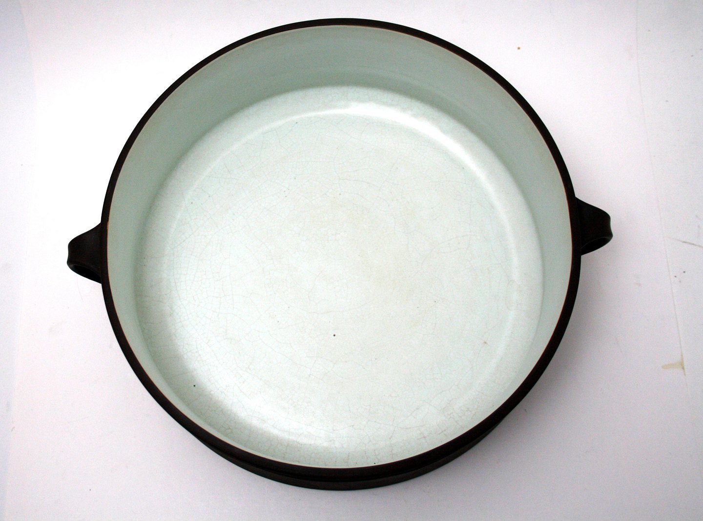 Eslau Danmark, Flamestone. Stor skål/terrin med ører og låg. Indvendig hvid glasur, yderside i rå uglaseret stentøj. Designet af Jens Harald Quistgaard i 1950,erne. Signeret IHQ, Dansk Designs, Denmark. Højde 9,5 cm. Diameter 26,5 cm. Længde 32 cm. Låg højde 7 cm. Overfladekrakelering i i glasuren indvendig. Pris: SOLGT