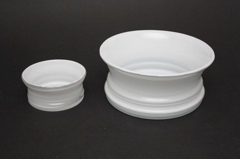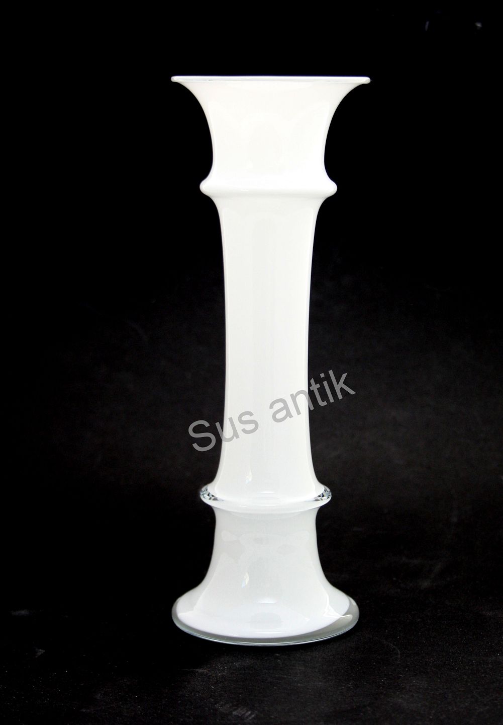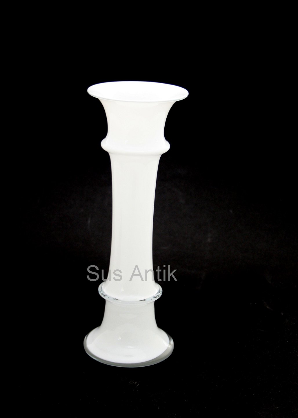 Holmegaard, MB serien designet af Michel Bang i 1981. Vase i formblæst opal hvid glas med klare krystal overfang. Der er ingen signatur i denne serie. Højde 21,5 cm. Øverste diameter 7,6 cm. Pris: 275 kr. stk. Lager: 3