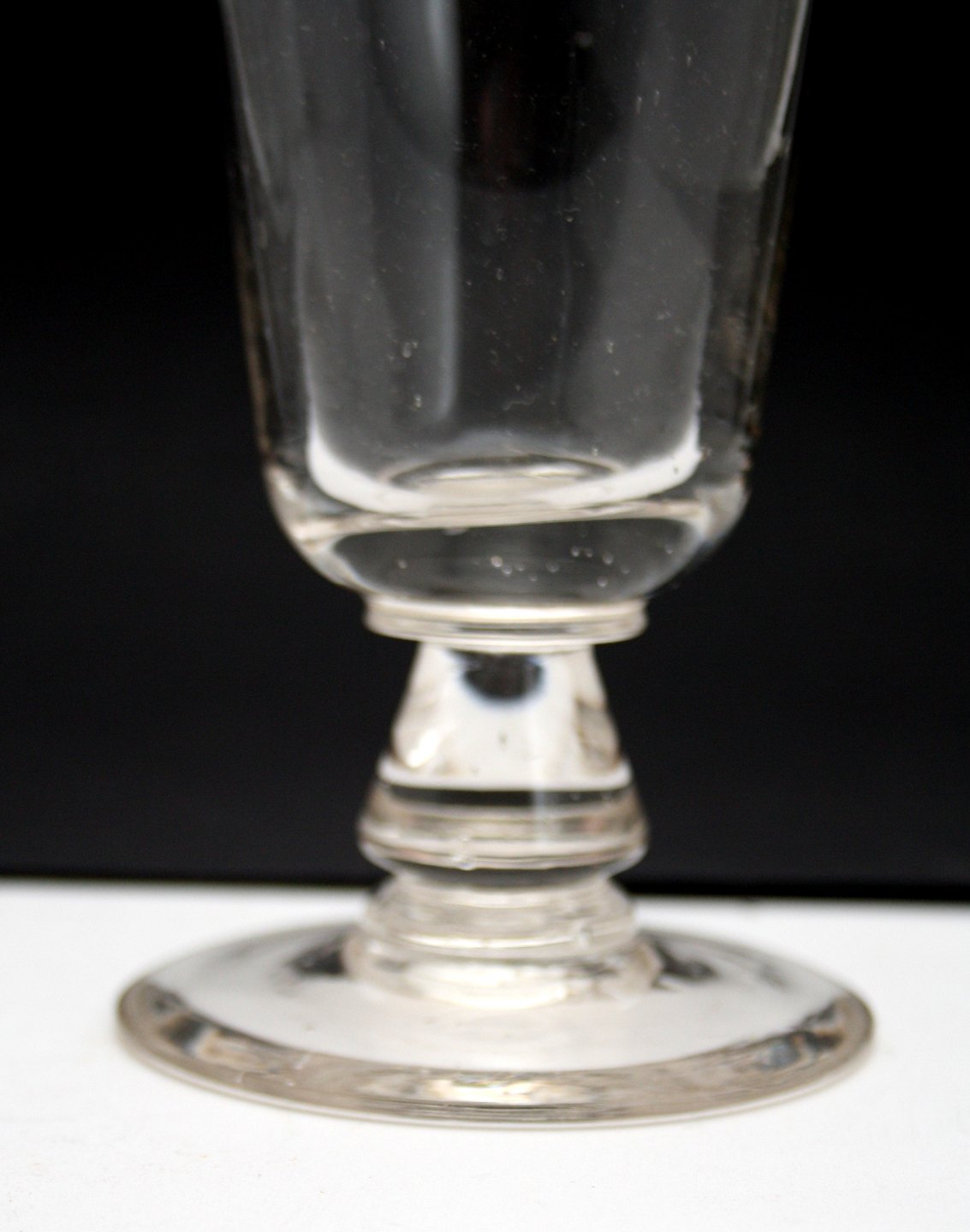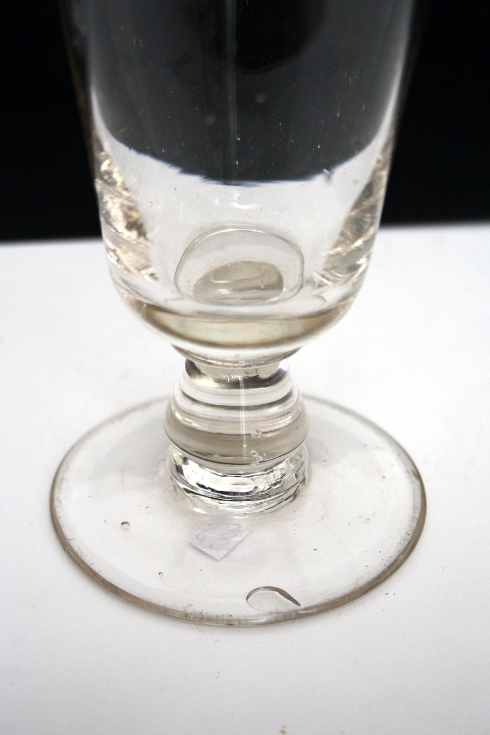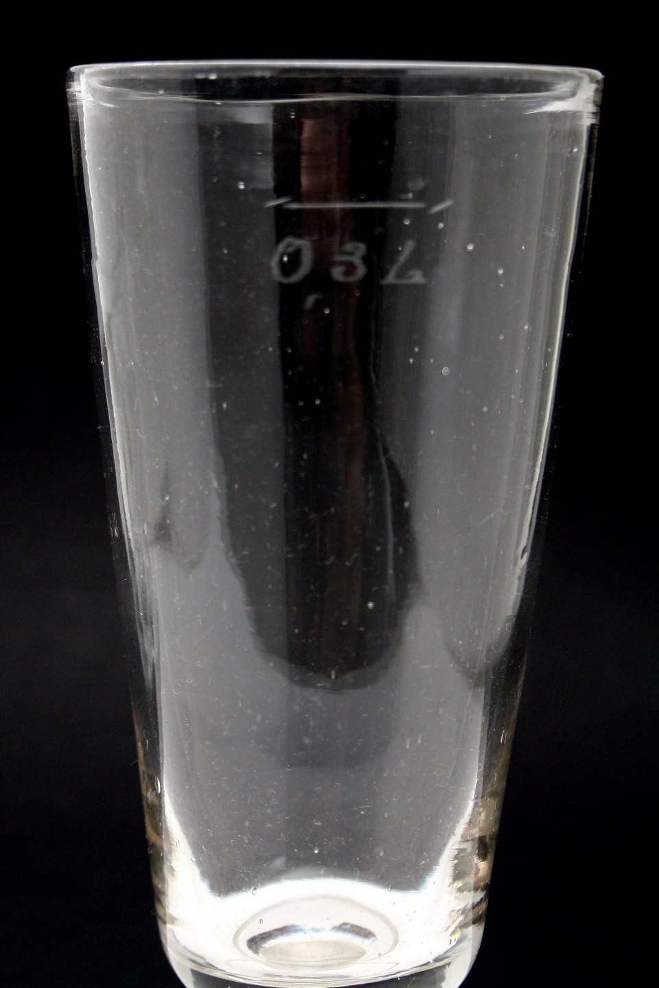 Porterglas med indgraveret mål 0,3 l og målestreg. Knækket i bund, stor luftboble i fod, opdrevet kumme. Højde 19 cm. Diameter 8 cm. Pris: SOLGT