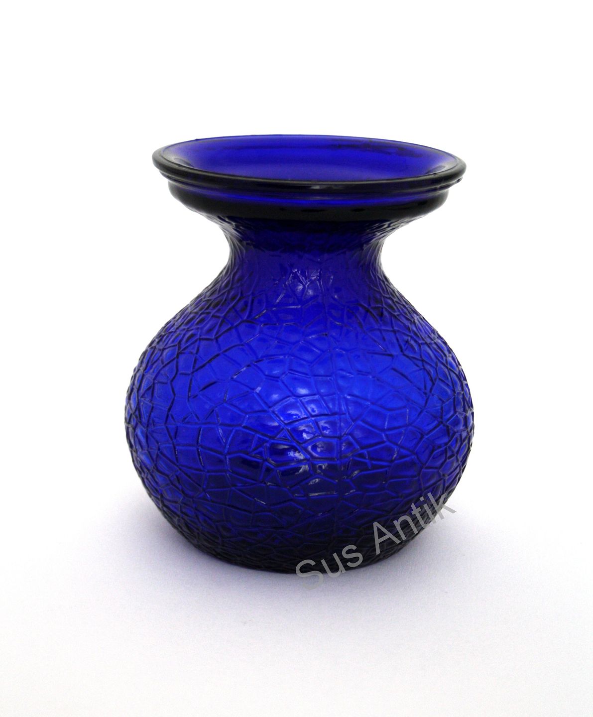 Fyens Glasværk "Blomsterløg" Kugleformet hyacinth glas/vase "net" mønster i maskinblæst presset koboltblå glas. Fra 1924. Højde 11,5 cm. Øverste diameter 9 cm. Største diameter ca. 11,5 cm. Pris: 250 kr. stk. Lager: 1