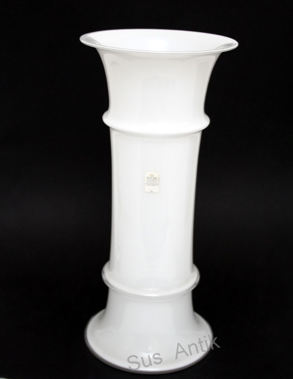 Holmegaard, MB serien designet af Michel Bang i 1981. Stor vase i formblæst opal hvid glas med klare krystal overfang. Der er ingen signatur i denne serie. Højde 30,8-31 cm. Øverste diameter 14 cm. Pris: 475 kr. stk. Lager: 4