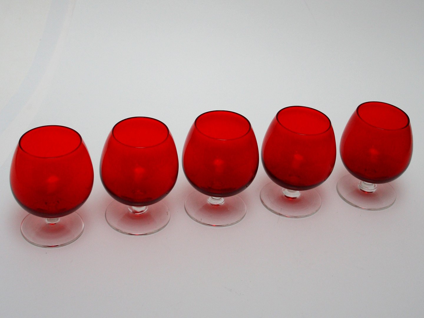 Røde cognacglas med klar stilk. Højde cm. Diameter 4,5 cm. Pris: 5 stk. sælges samlet 300 kr.