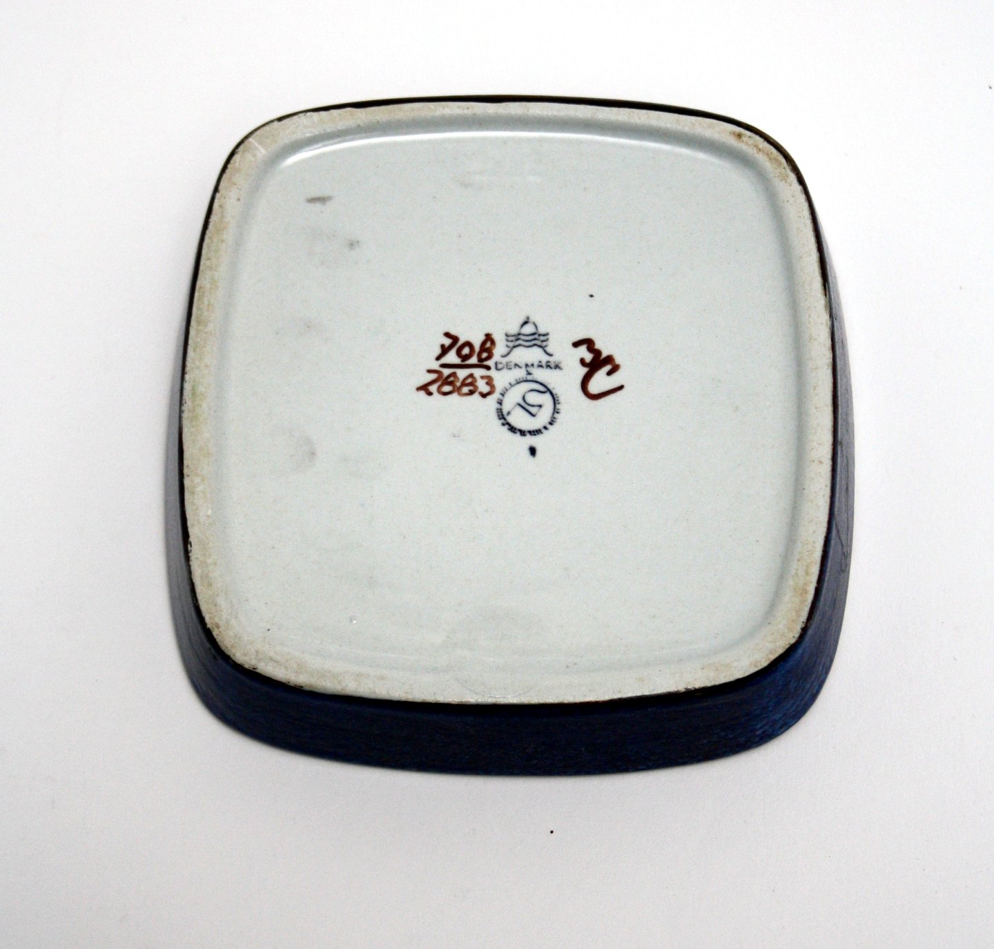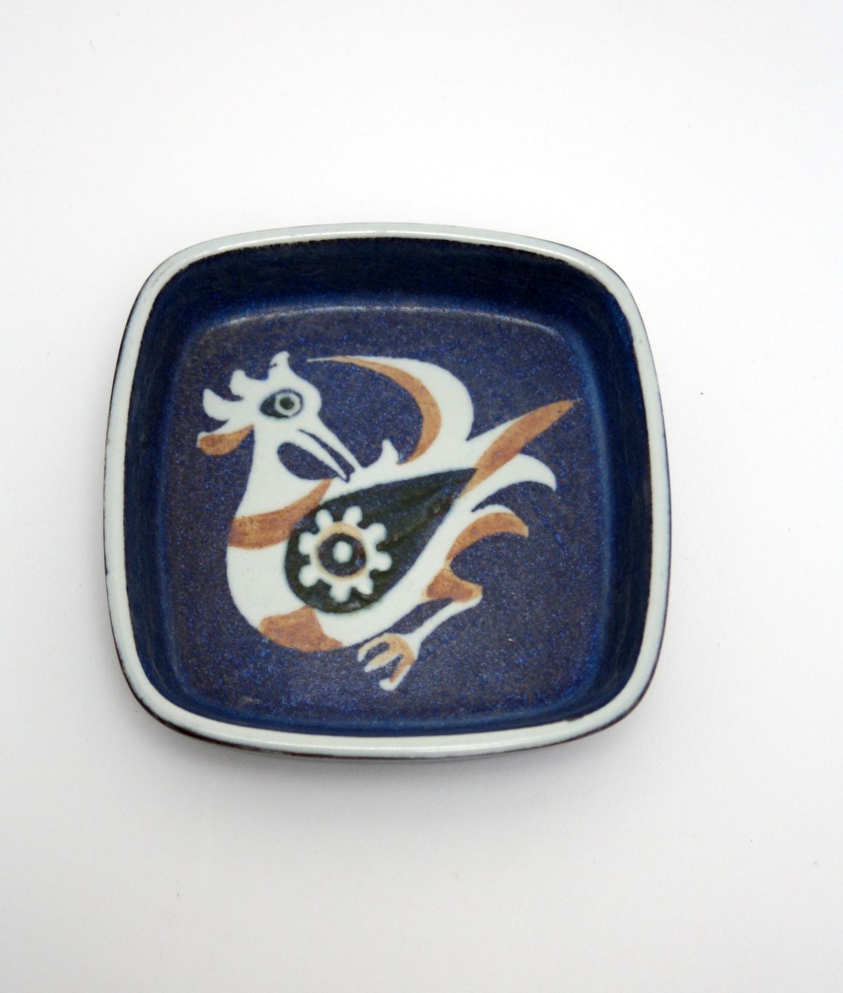 Royal Copenhagen, Baca Kunstfajance, Blåt fad/skål med fugl. Designet af Niels Thorsson. Nr. 708-2883. 11 x 11 cm. Højde ca. 2,5 cm. Pris: SOLGT